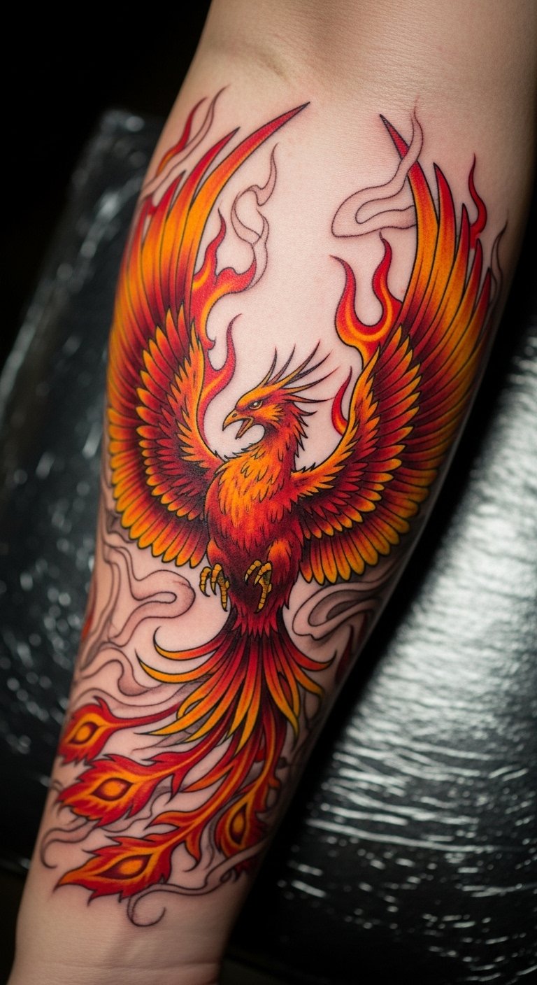 This tattoo symbolizes powerful transformation and renewal, embodying the essence of resilience and rebirth.