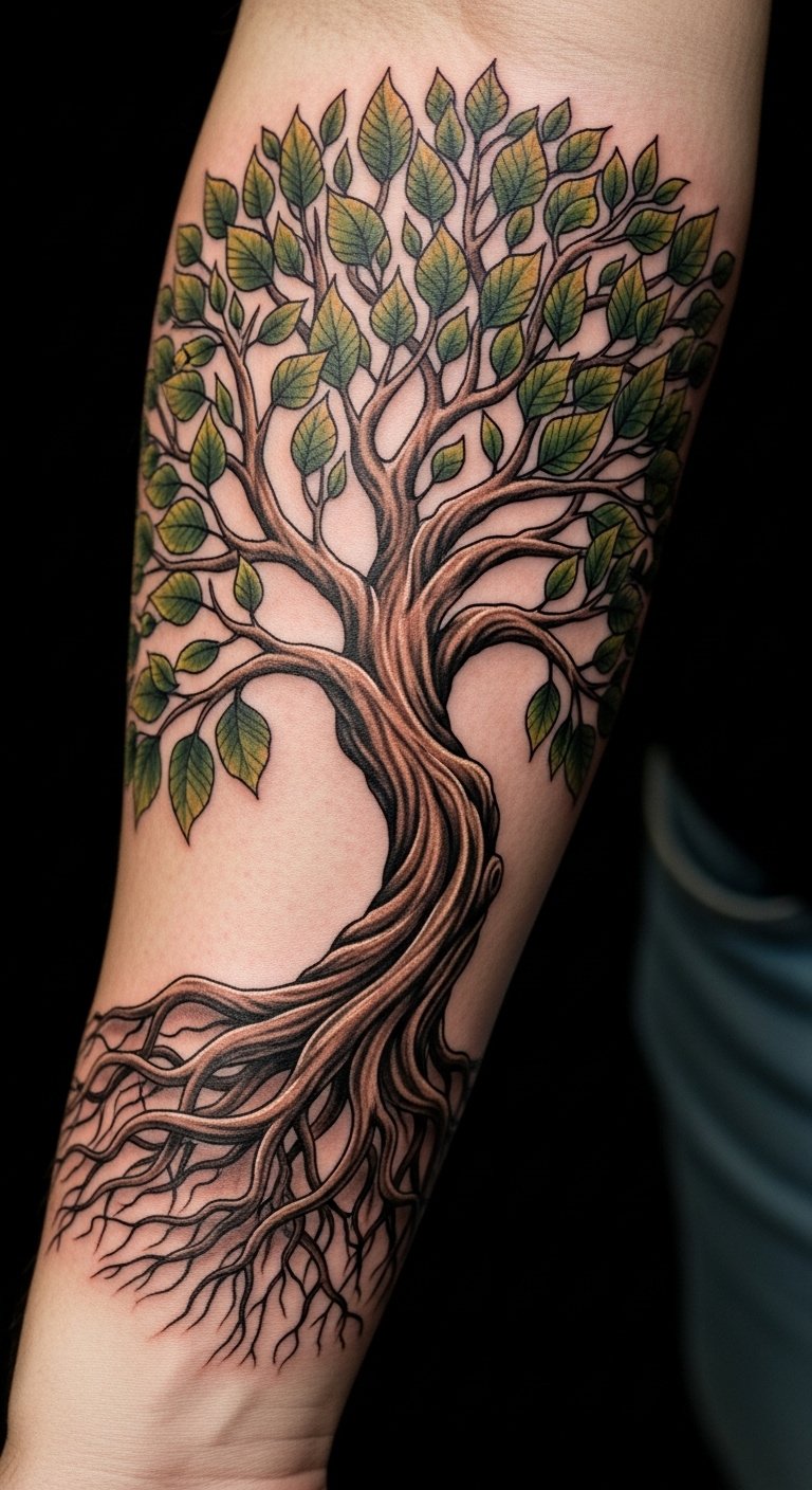 This Tree of Life tattoo symbolizes the profound interconnectedness of all existence, illustrating how each experience contributes to personal growth and resilience.