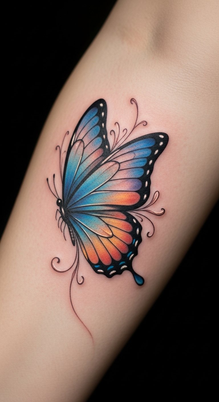 This butterfly tattoo, placed on the inner forearm, symbolizes personal growth and the beauty that emerges from life’s struggles.