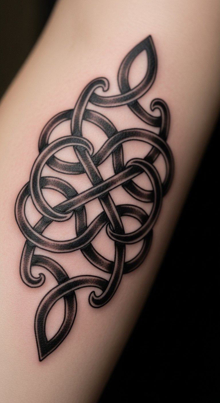 The Celtic knot tattoo symbolizes the eternal connections and cyclical nature of existence, weaving together life and death in a harmonious dance.