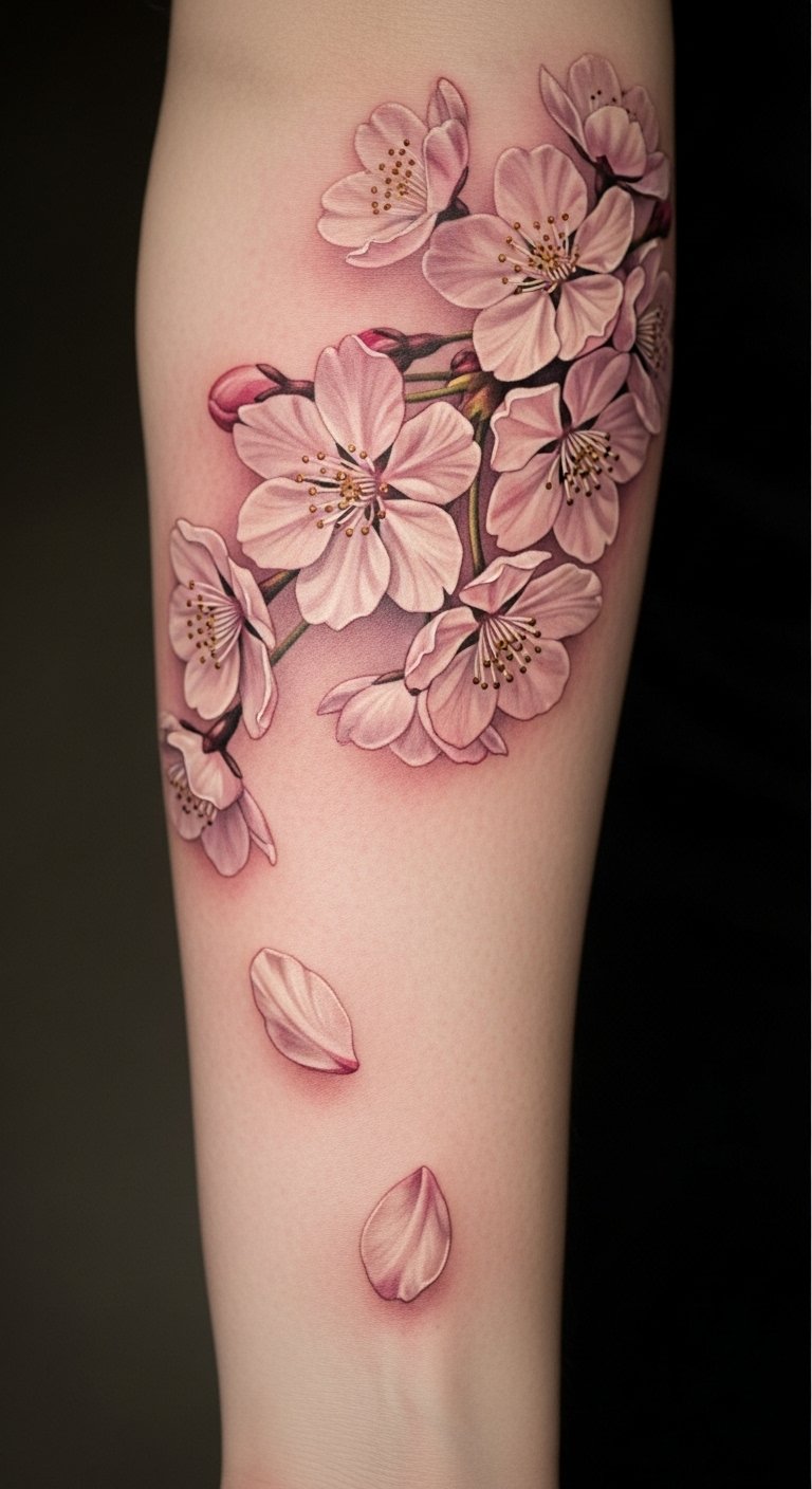 This tattoo design symbolizes the beauty of impermanence and the fleeting nature of life, resonating with the Japanese cultural appreciation for cherry blossoms.