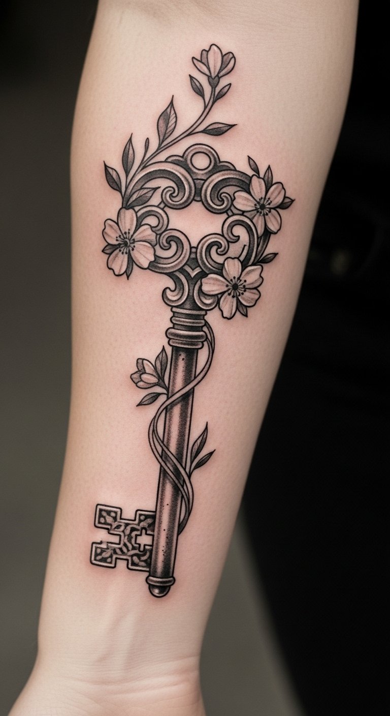 The skeleton key tattoo symbolizes the unlocking of life’s mysteries and personal journeys. Its placement on the forearm allows for easy visibility, serving as a daily reminder of the transformative experiences that await.