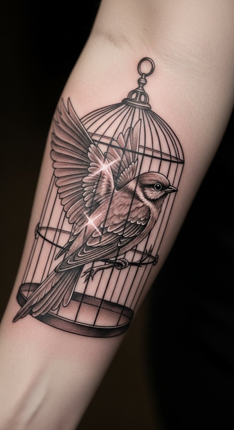 The caged bird tattoo symbolizes the struggle for freedom and resilience against life’s challenges.