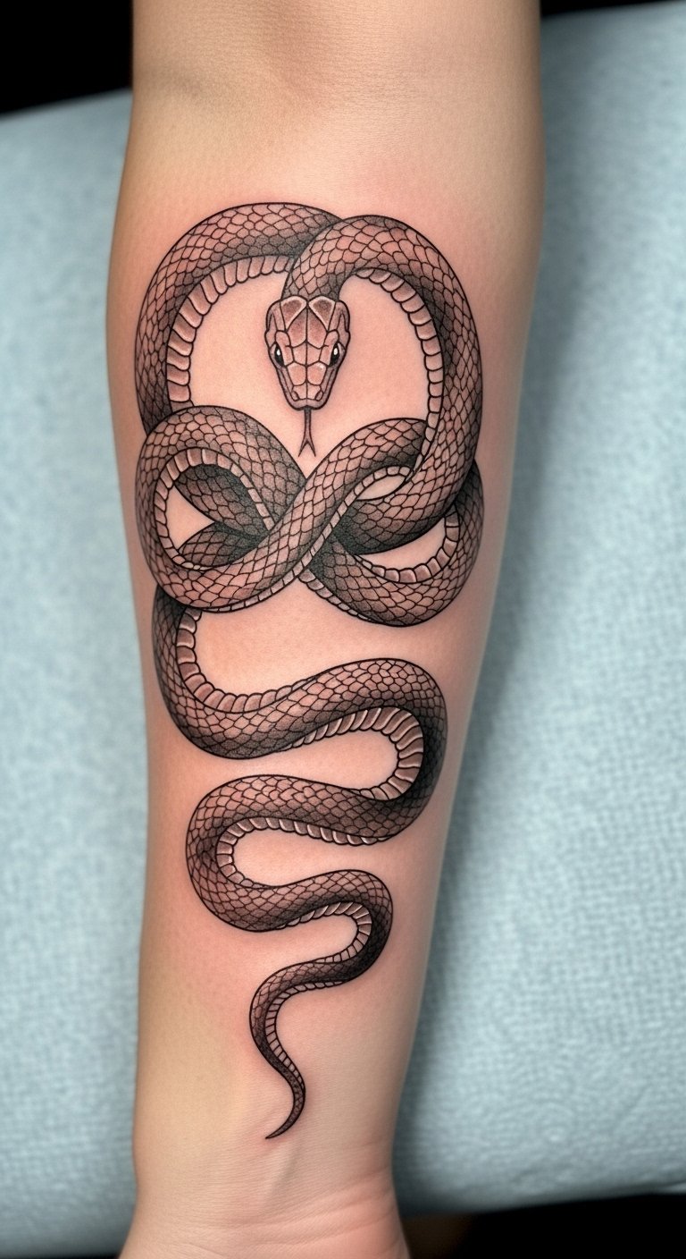 The Ouroboros tattoo on the forearm represents the eternal cycle of life, embodying growth, transformation, and the balance of beginnings and endings.