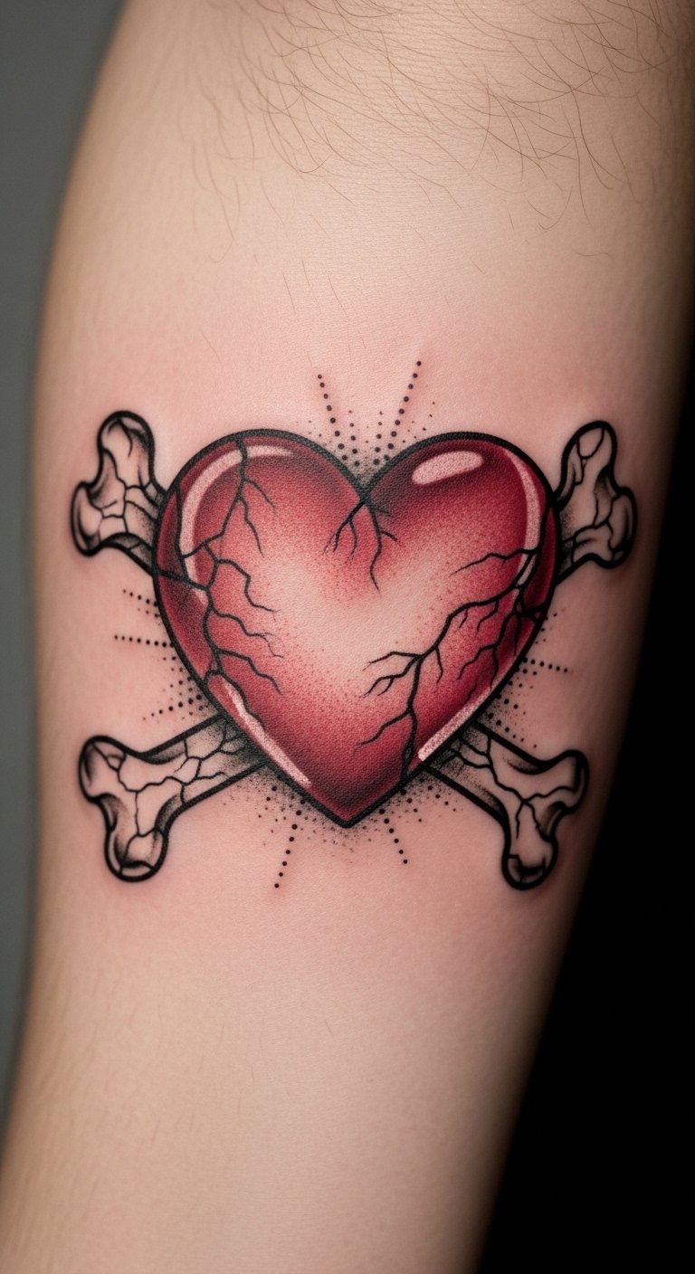 The placement on the forearm allows for visibility, inviting conversations about its deep meaning. The heart symbolizes enduring love, while the crossbones represent mortality, together forming a powerful reminder that true love remains eternal, navigating the complexities of joy and sorrow through life’s journey.