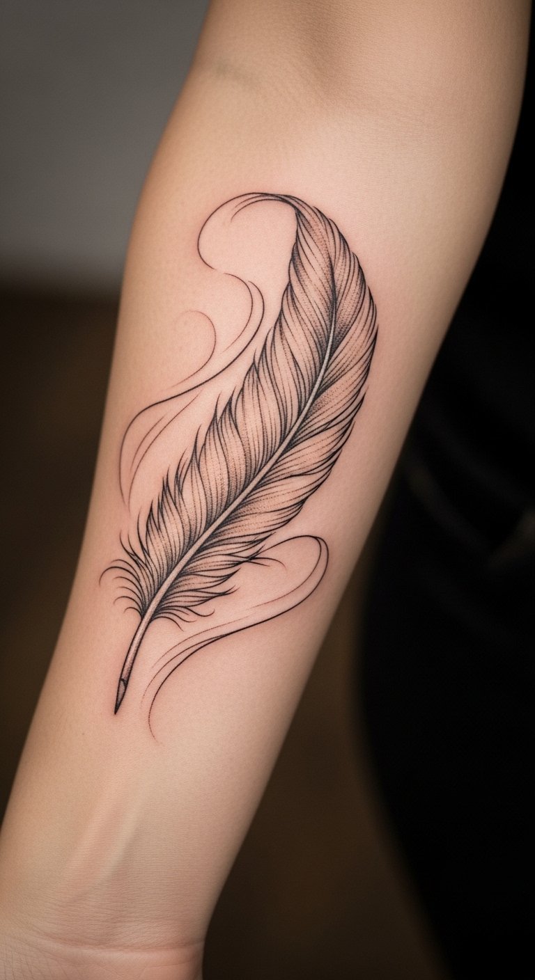 The feather tattoo on the forearm symbolizes a profound spiritual connection and the journey of personal transformation.