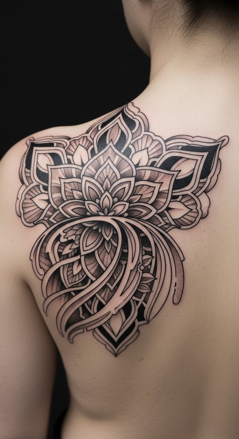 This mandala tattoo on the upper back symbolizes unity and the interconnectedness of all things.