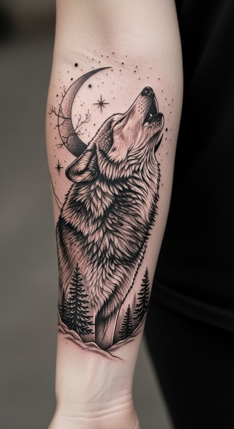 Positioned on the forearm, it serves as a constant reminder of personal growth and the strength found in community, echoing the wolf’s pack mentality.