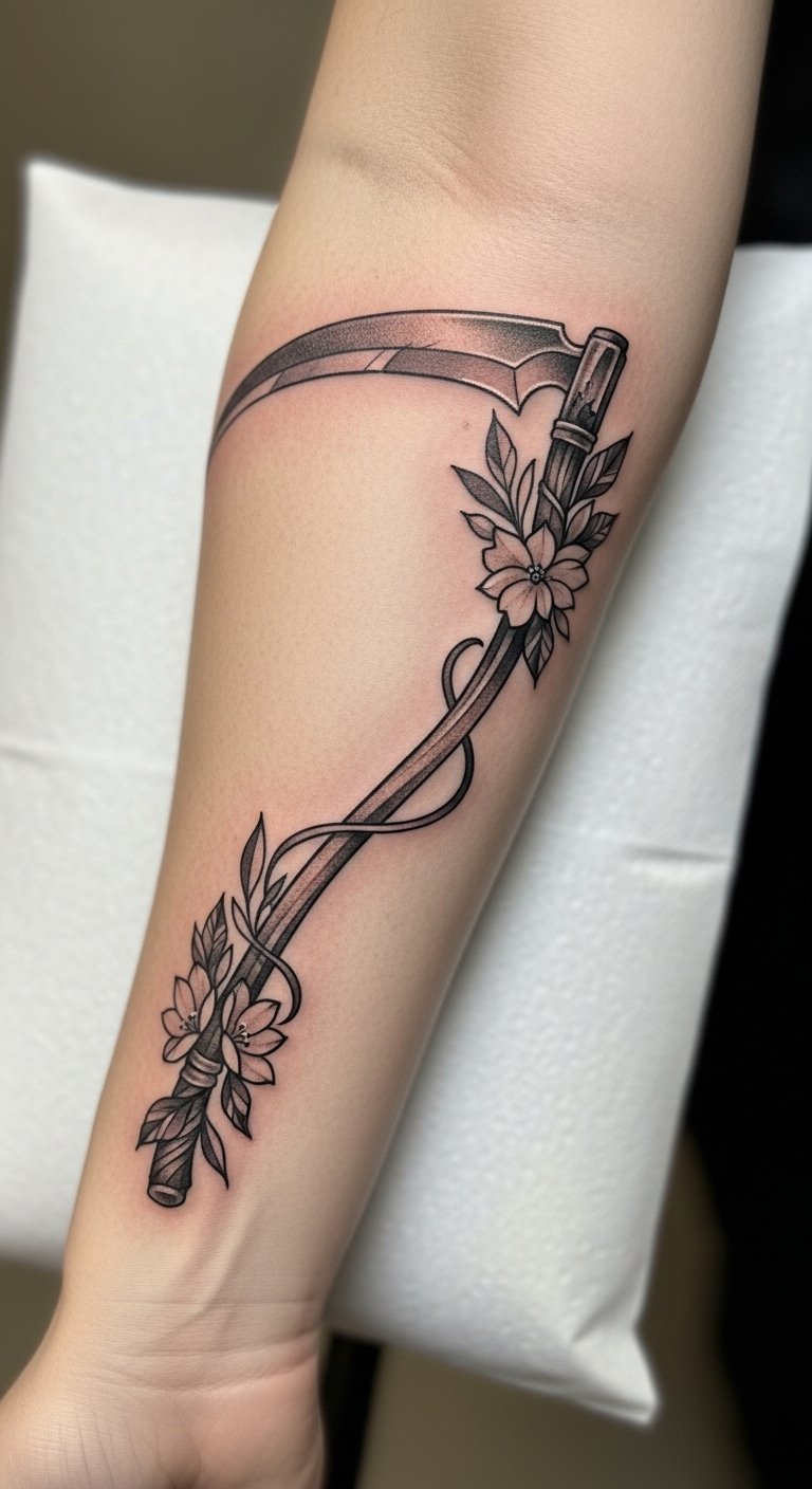 The scythe, often seen as a harbinger of the final harvest, is intertwined with floral elements to reflect beauty amidst mortality and transformation.