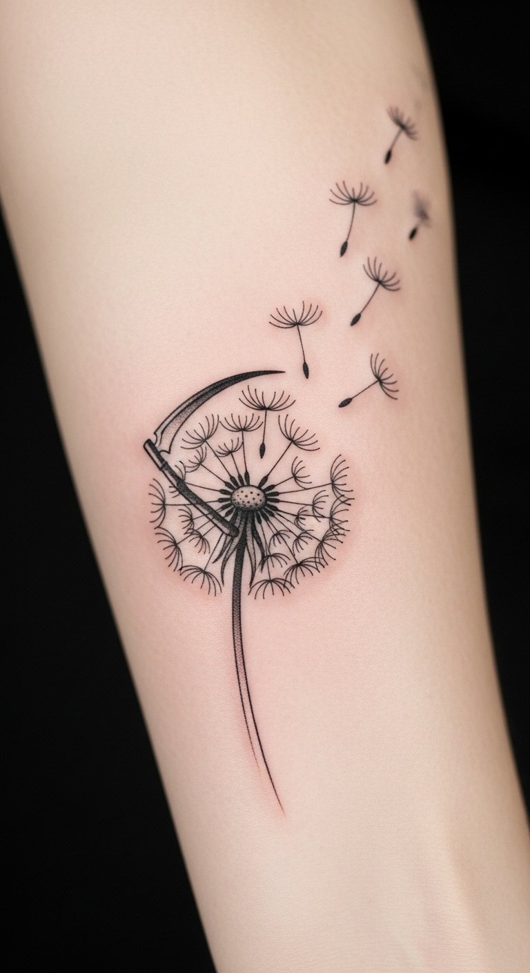 The delicate dandelion and scythe together symbolize the inevitability of life’s cycles, encouraging the wearer to embrace their connection to nature and the journey of their own life.