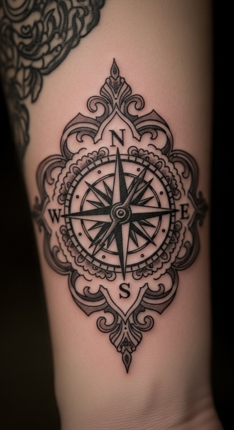 This compass tattoo is a profound symbol of your journey through life, reflecting the choices you make and the adventures that lie ahead.