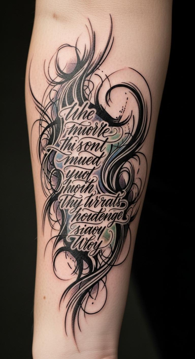 The flowing script, combined with abstract elements, symbolizes the complex layers of inner struggles and triumphs, turning personal narrative into a work of art.