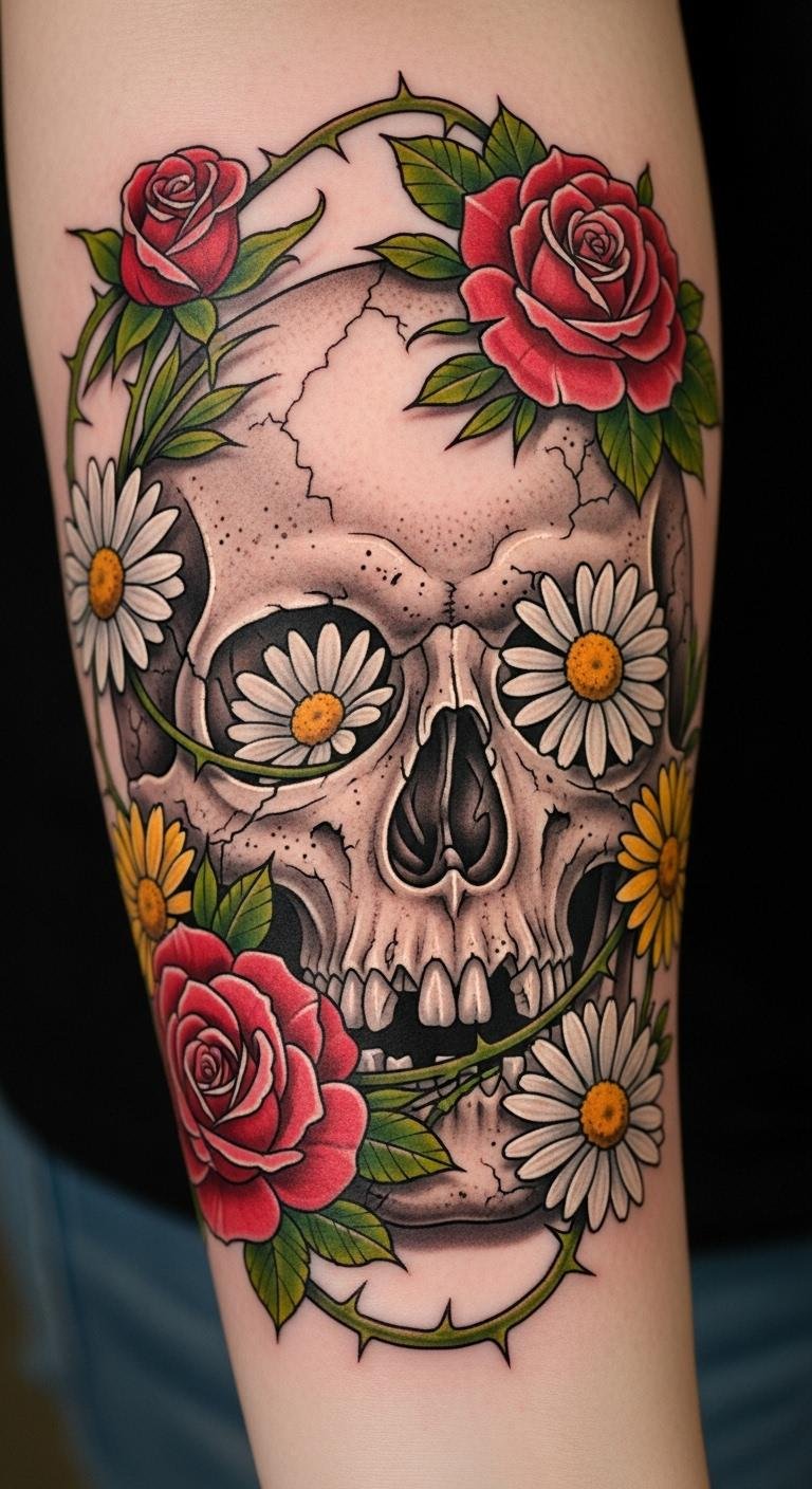 The vibrant flowers represent cherished memories, while the skull reflects the inevitability of death, creating a powerful juxtaposition that invites contemplation and appreciation for life’s fleeting moments.