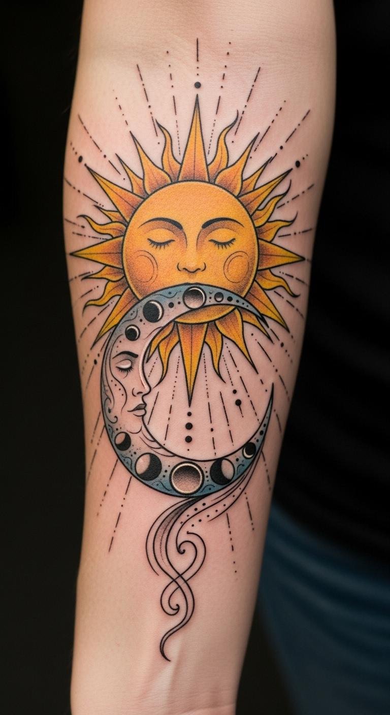 Positioned on the forearm, it serves as a constant reminder of life’s cycles, honoring both the brightness of joy and the shadows of struggle, creating harmony within.