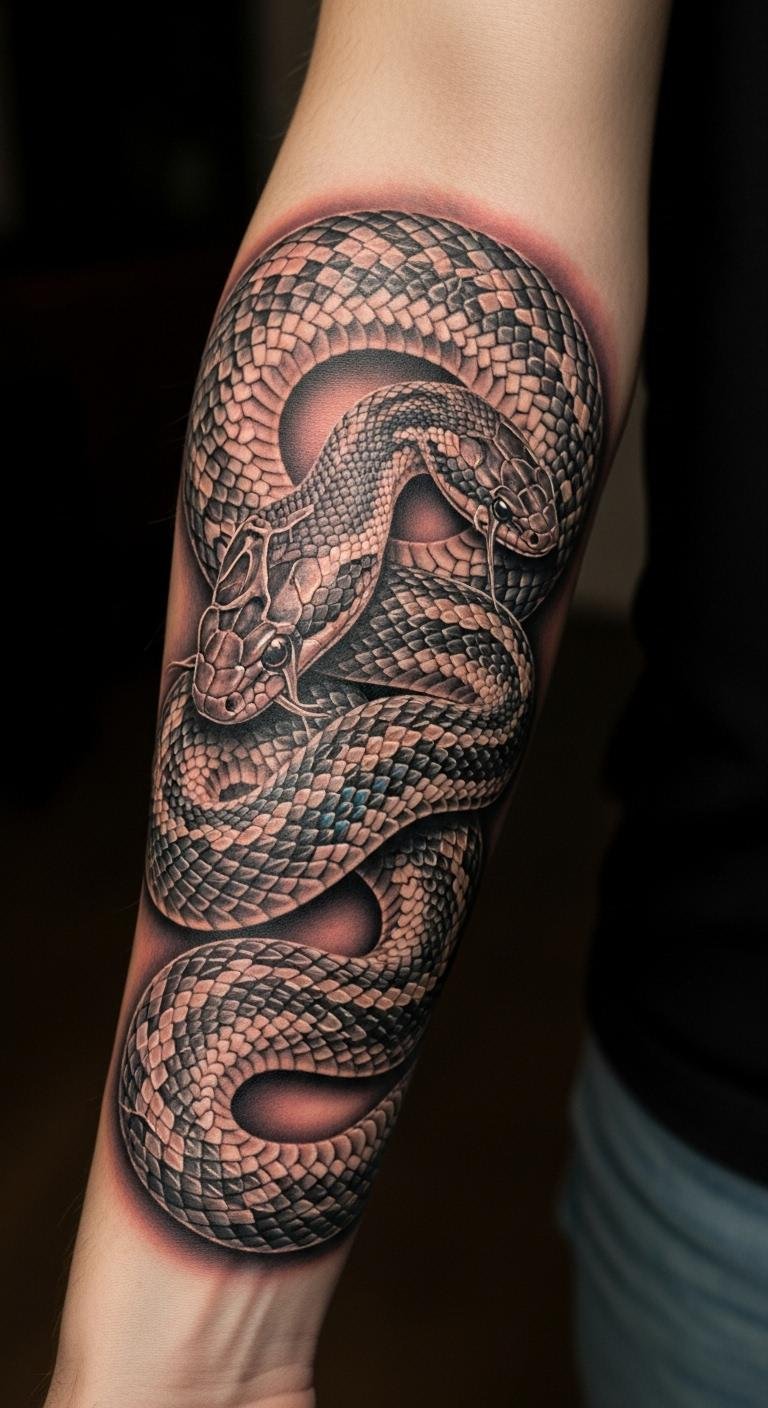 This tattoo symbolizes the transformative journey of personal growth and the courage to embrace change. Positioned on the forearm, it serves as a visible reminder of resilience and adaptability, encouraging the wearer to celebrate their evolution. The snake’s shedding skin reflects the beauty of renewal and the strength found in letting go of the past, making it a powerful emblem of rebirth.