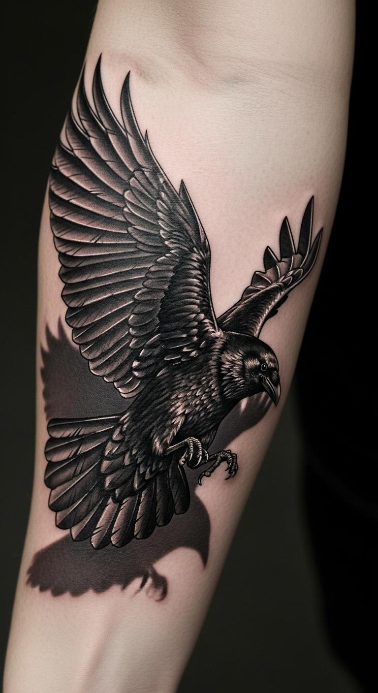 The raven’s flight signifies freedom and rebirth, while its dark feathers evoke the shadows of hardship, making this tattoo a powerful emblem of guidance through personal metamorphosis.