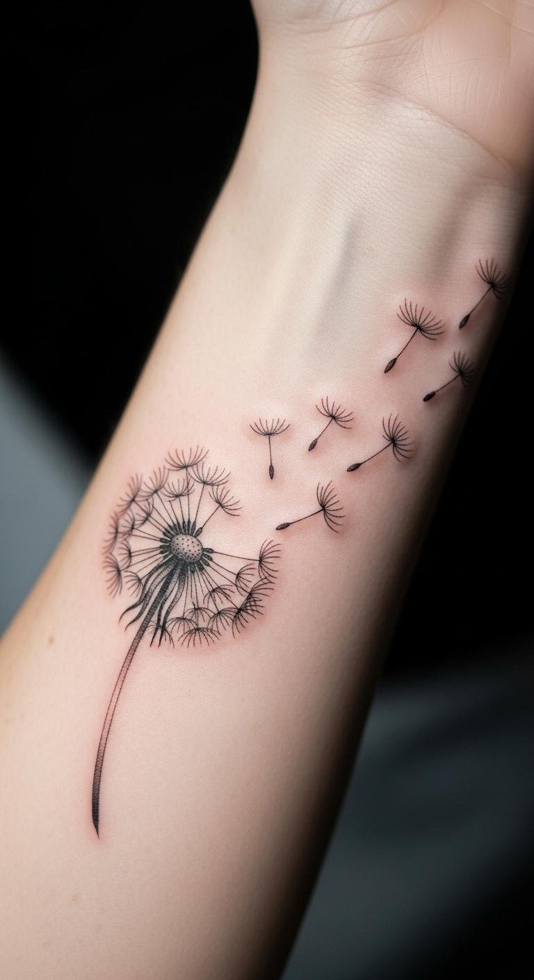 This dandelion tattoo, placed on the inner forearm, serves as a constant reminder of resilience and personal growth.