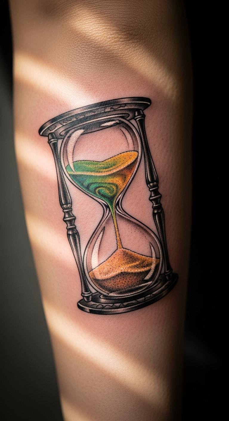 This hourglass tattoo serves as a potent reminder of life’s ebb and flow, encapsulating the journey of healing.