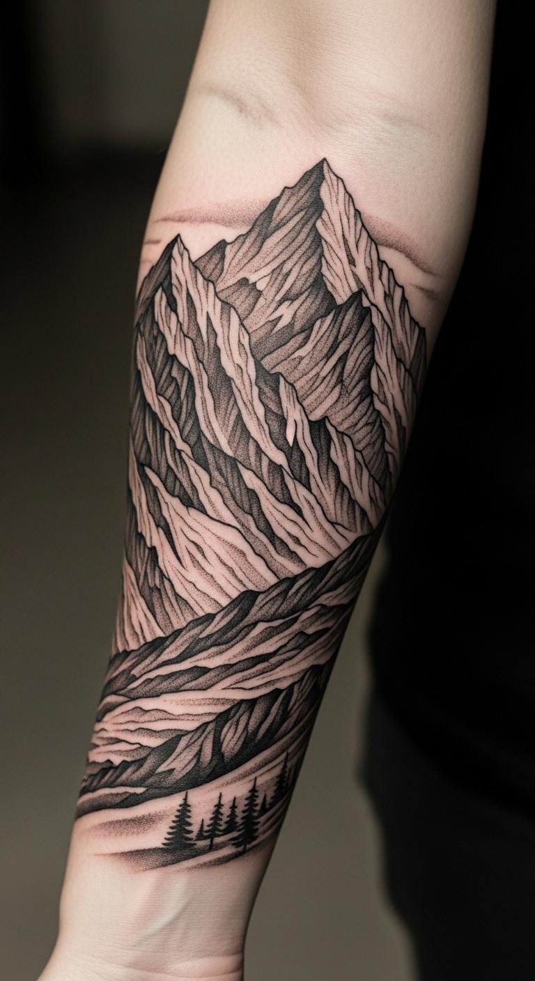 This mountain range tattoo serves as a powerful reminder of personal growth and resilience.