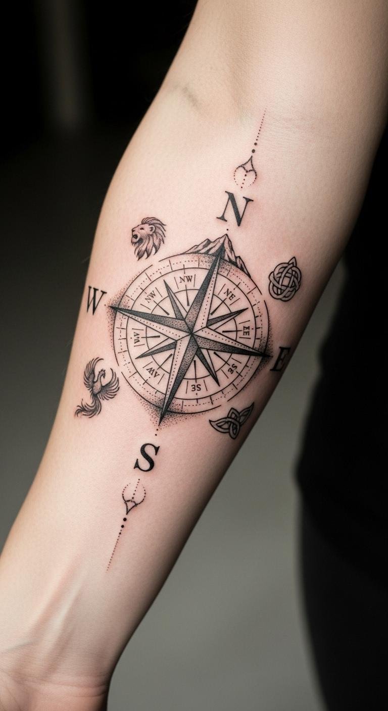 The compass tattoo, prominently displayed on the forearm, serves as a constant reminder of one’s journey through life’s challenges.