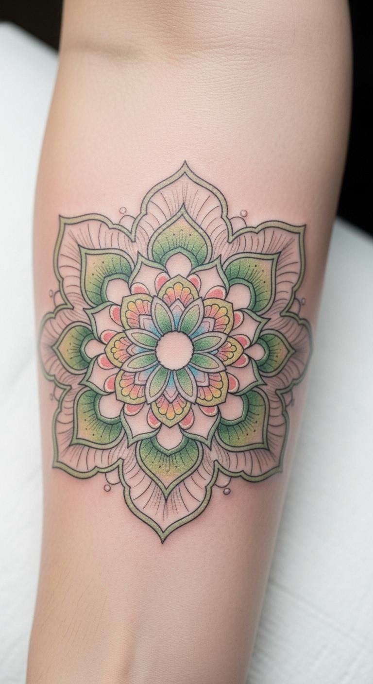 Placed on the forearm, it remains easily visible, allowing for daily reminders of resilience and serenity. The floral elements evoke a sense of beauty and tranquility, while the mandala’s circular shapes signify wholeness and balance, making it a profound emblem of strength amidst life’s challenges.