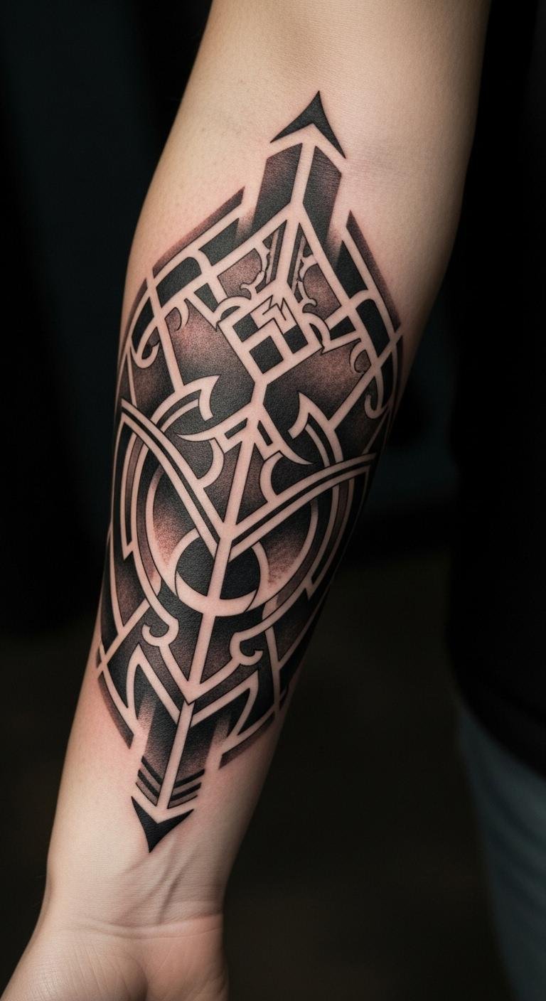 This tattoo embodies strength and resilience through its intricate geometric patterns, symbolizing the journey of personal growth and inner power.