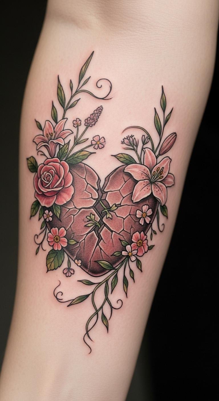 The broken heart, adorned with flowers and vines, symbolizes the beauty found in healing, transforming pain into strength.