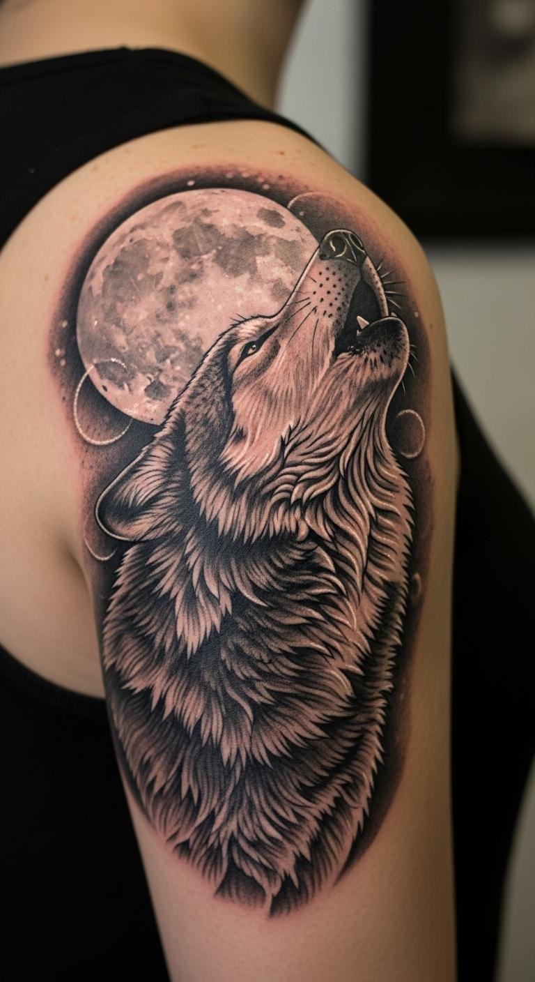 This tattoo symbolizes the journey of inner strength and resilience. The wolf represents loyalty, instinct, and a deep connection to freedom, while the moon amplifies your inner voice and intuition.