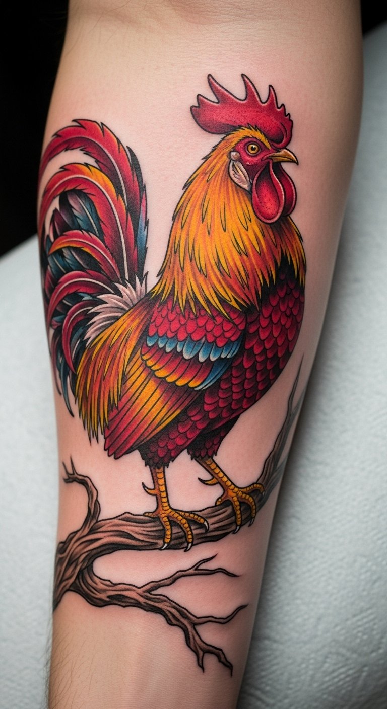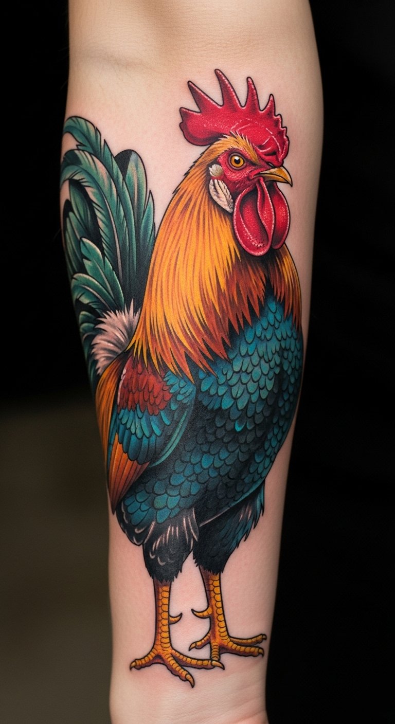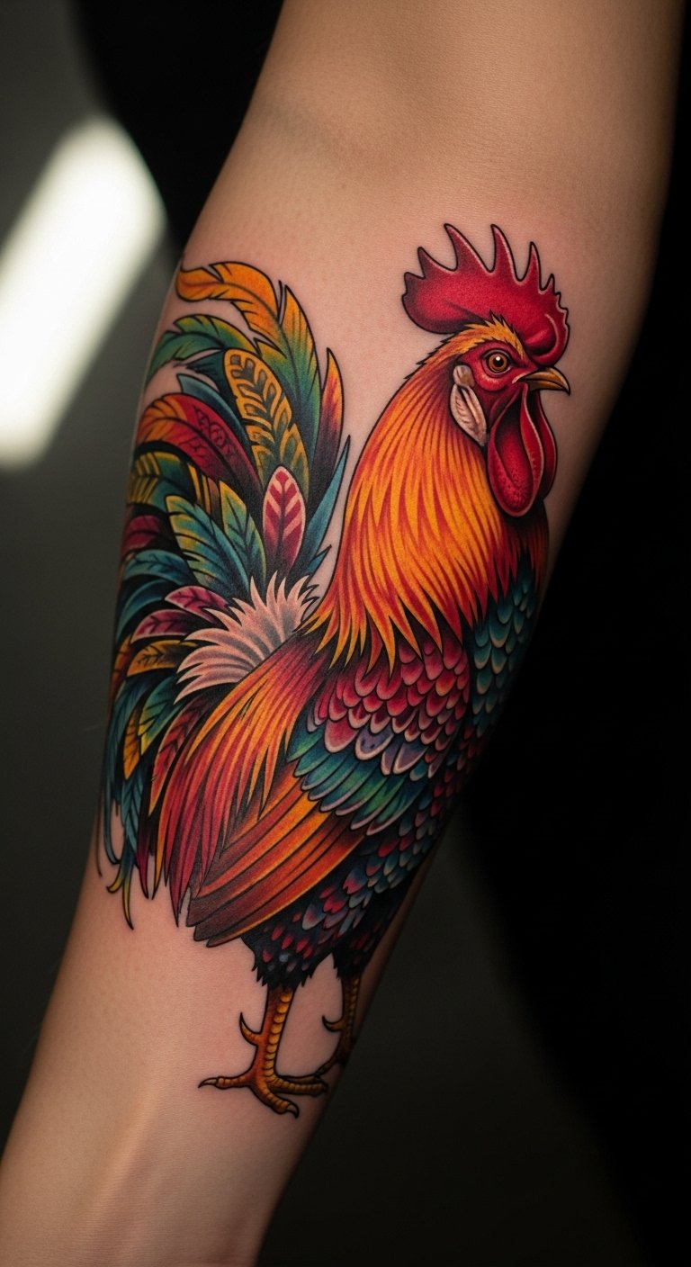 This tattoo symbolizes strength, fidelity, and resilience, embodying the spirit of the rooster.