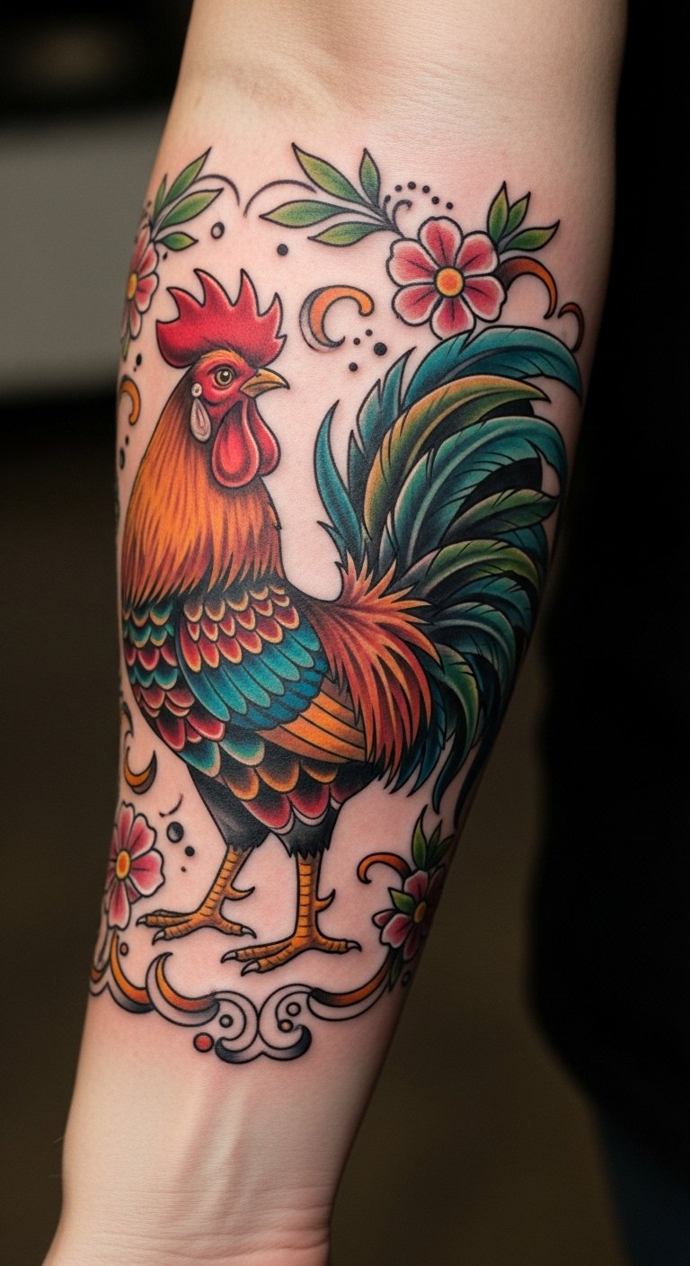 This tattoo symbolizes resilience and renewal, embodying the spirit of the rooster as a powerful figure across cultures. Its placement on the forearm allows for visibility, serving as a constant reminder of inner strength and determination. The combination of colors and design details reflects a vibrant personality, inspiring the wearer to embrace their journey boldly. The surrounding floral elements add a touch of life and growth, illustrating the interconnectedness of strength and beauty in everyday experiences.