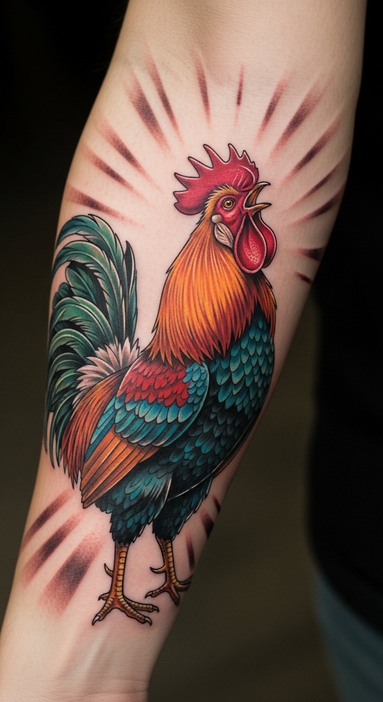 The placement of this rooster tattoo on the forearm symbolizes boldness and resilience, allowing the wearer to carry the spirit of courage and renewal in a visible manner.