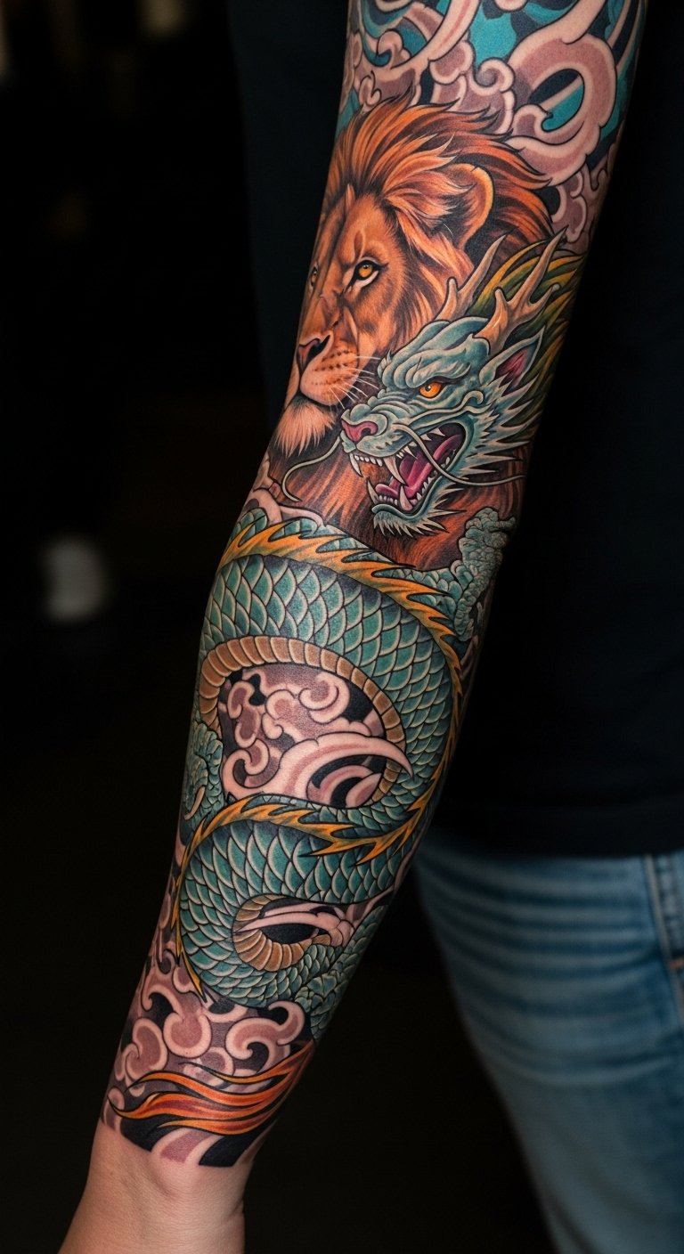 This tattoo embodies strength and courage, with the lion symbolizing bravery and the dragon representing wisdom and power.
