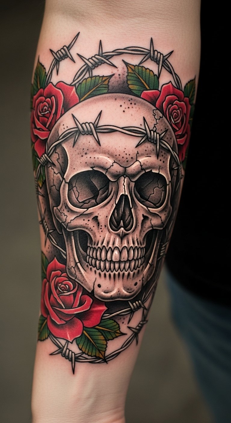 Positioned on the forearm, it serves as a bold statement, easily visible to the world, reflecting the wearer’s fearless attitude and individuality. The barbed wire signifies strength and resilience, while the intricate designs narrate a story of unyielding spirit, making it a powerful piece of personal art.