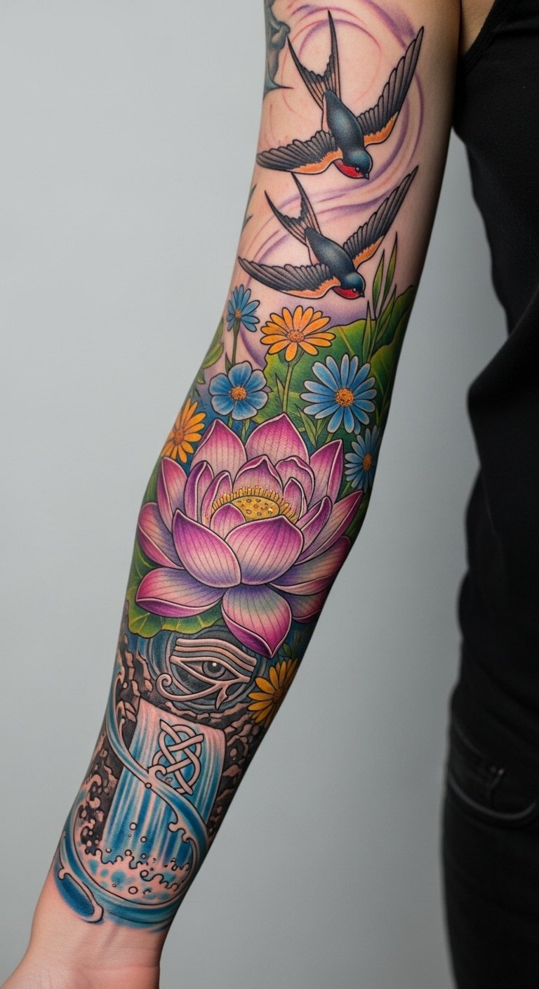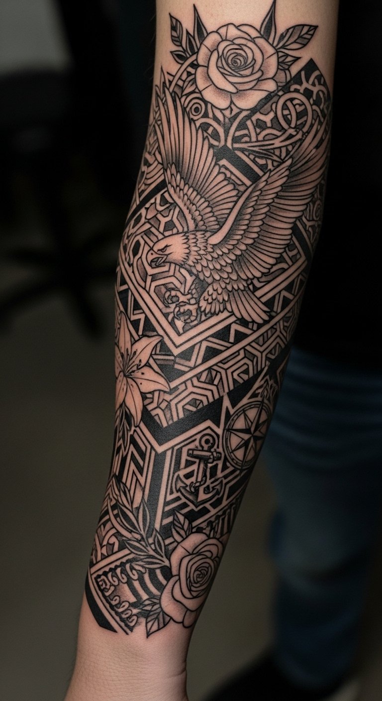 Positioned on the forearm, this sleeve serves as a constant reminder of one’s identity and life story, inviting conversation and reflection.
