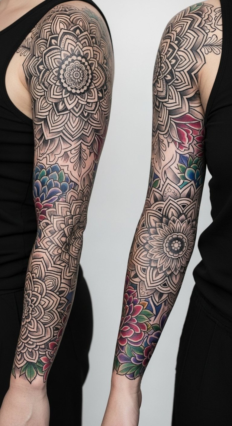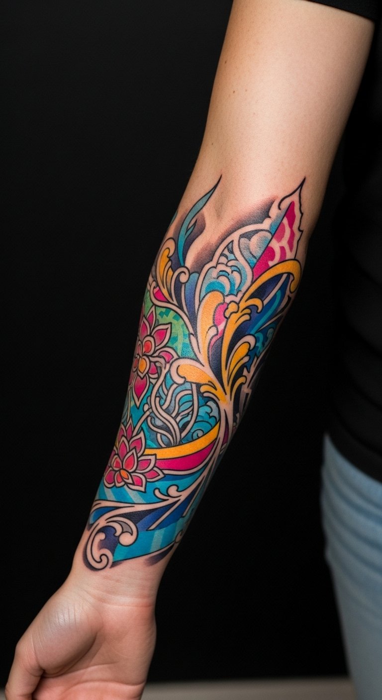 This vibrant sleeve tattoo symbolizes personal growth and freedom, with the floral elements representing resilience and beauty in adversity, while the abstract shapes evoke a sense of movement and transformation.