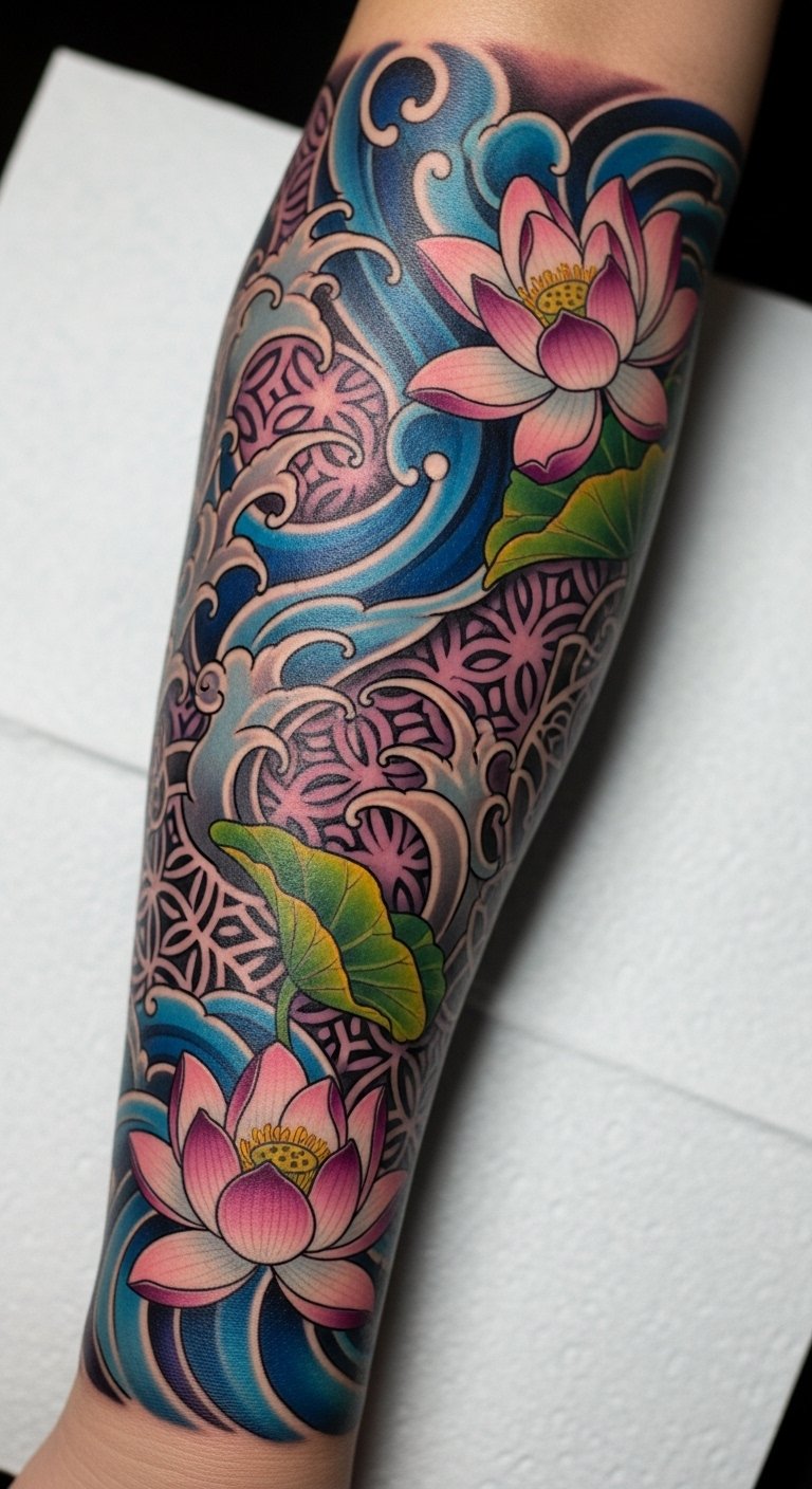 The tattoo symbolizes the journey of personal growth and transformation, with the waves representing the ebb and flow of life’s challenges, while the lotus flowers stand for purity and rebirth.