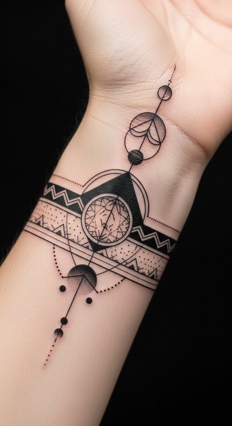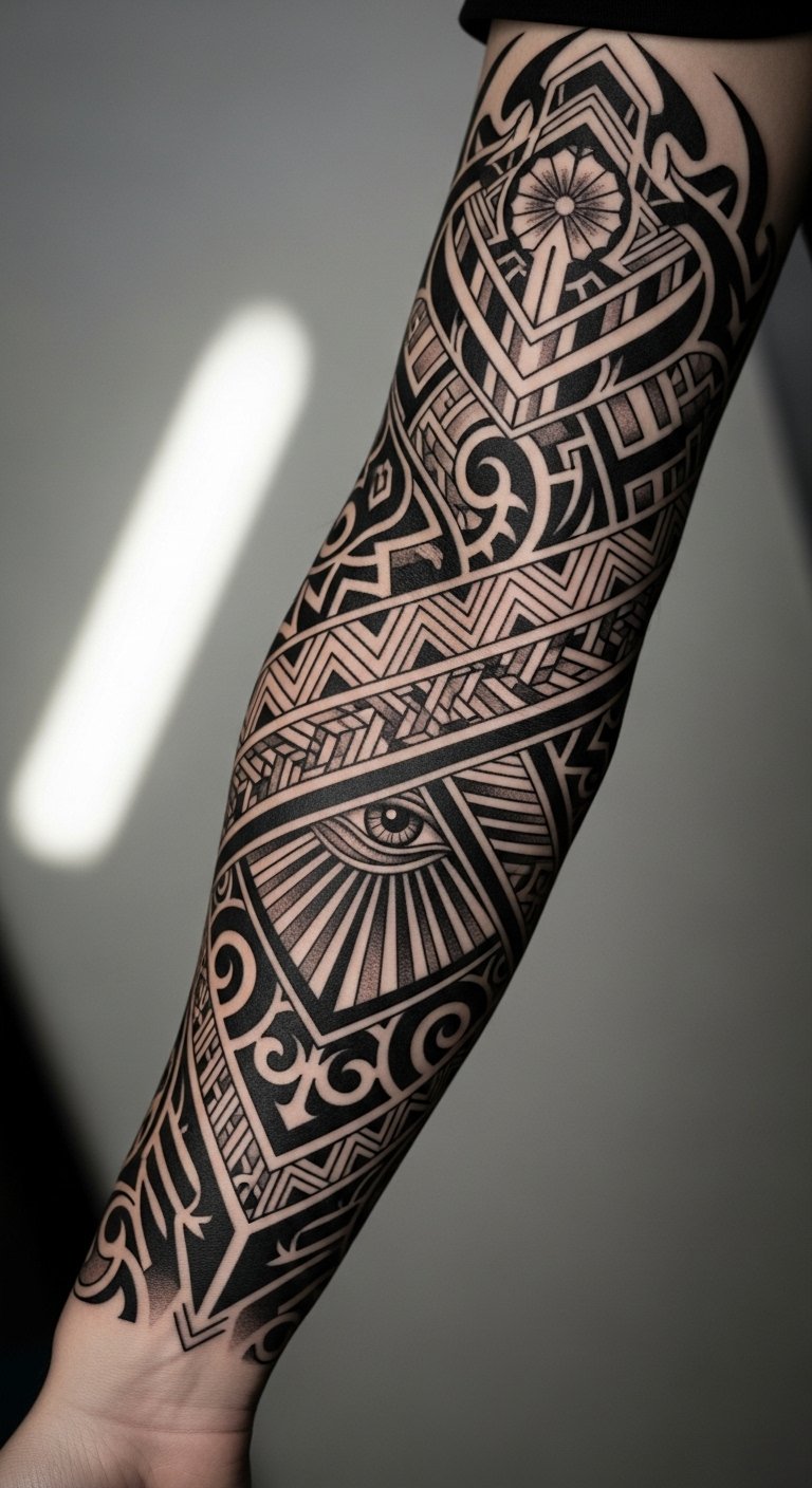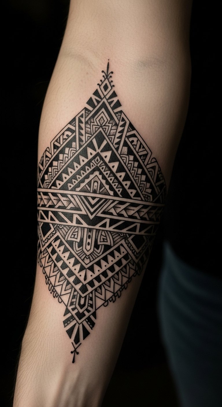 The geometric and tribal elements symbolize resilience and confidence, inviting admiration and conversation.