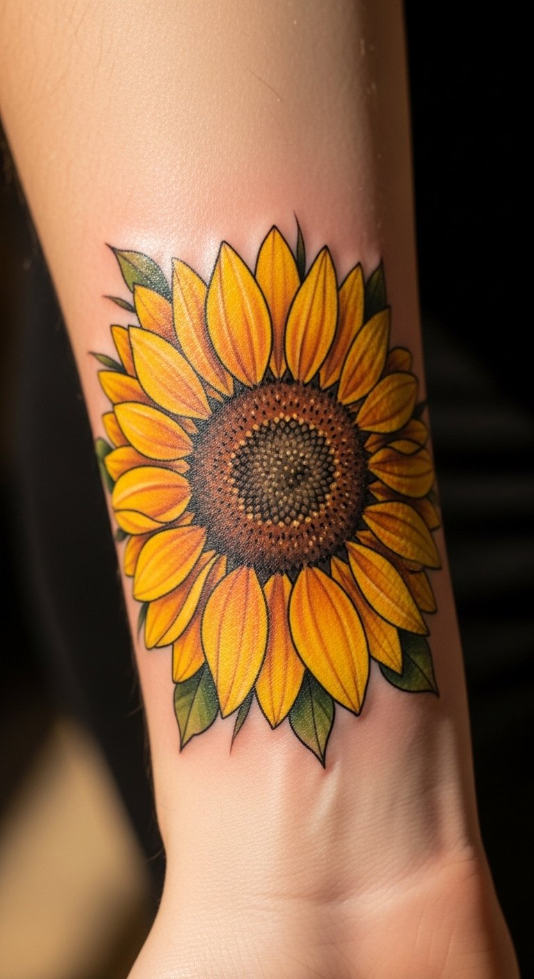 This sunflower tattoo symbolizes optimism and good fortune, acting as a daily reminder of loyalty and liveliness.