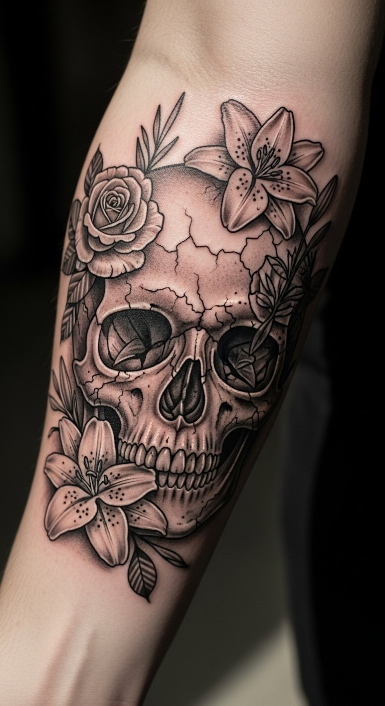 This skull tattoo, placed on the forearm, serves as a striking reminder of life’s impermanence and the beauty of transformation.