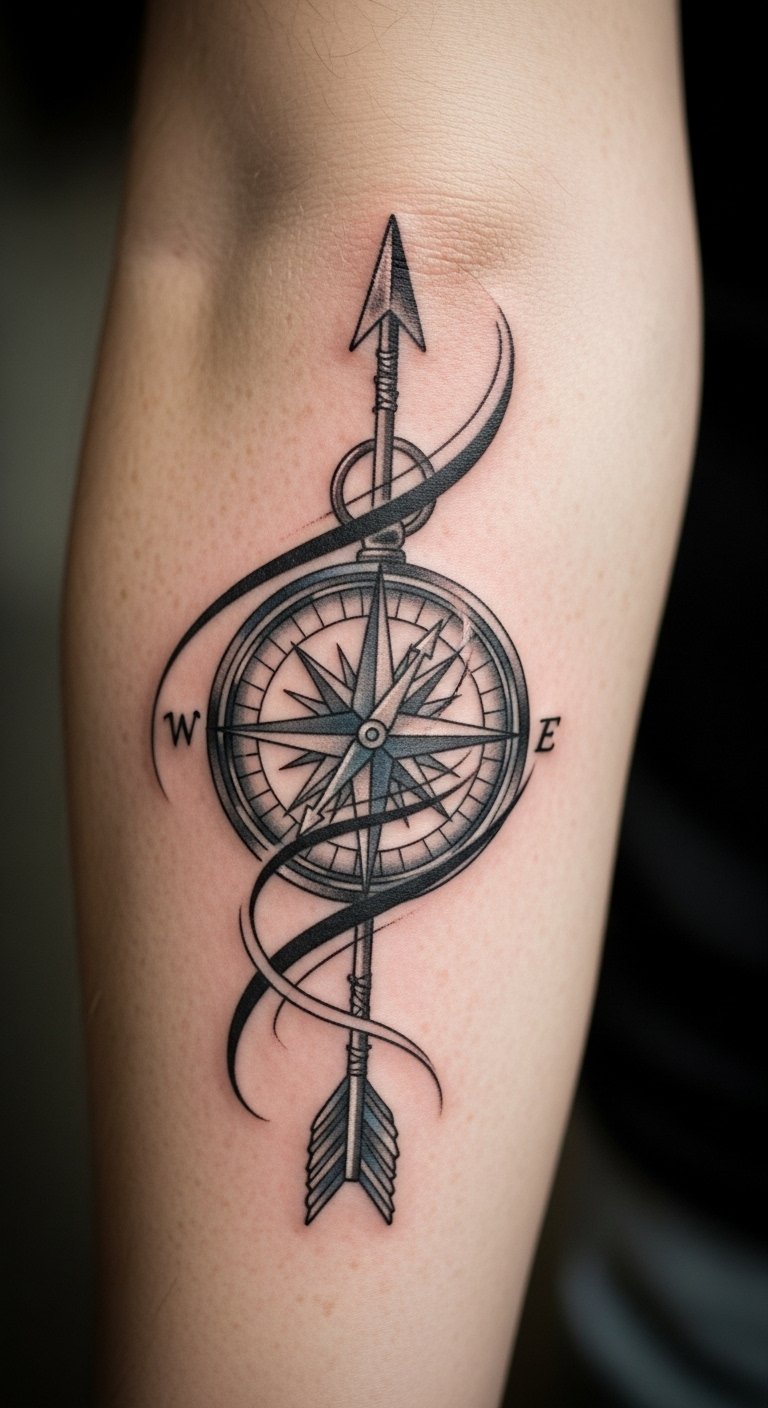 This tattoo, placed on the forearm, symbolizes direction and purpose, resonating with the wearer’s journey of self-discovery.