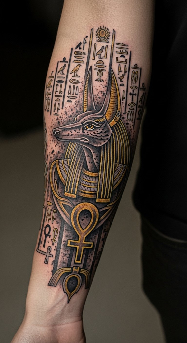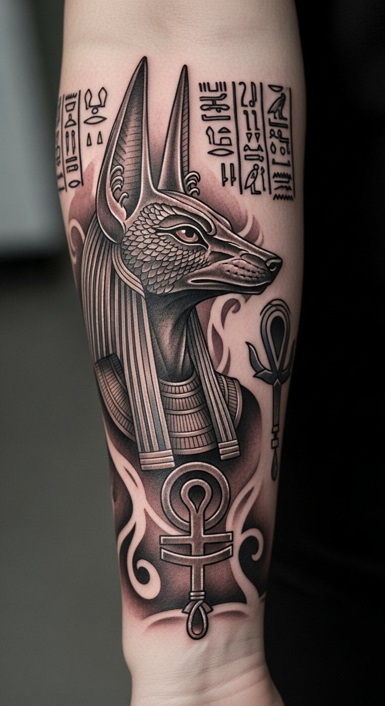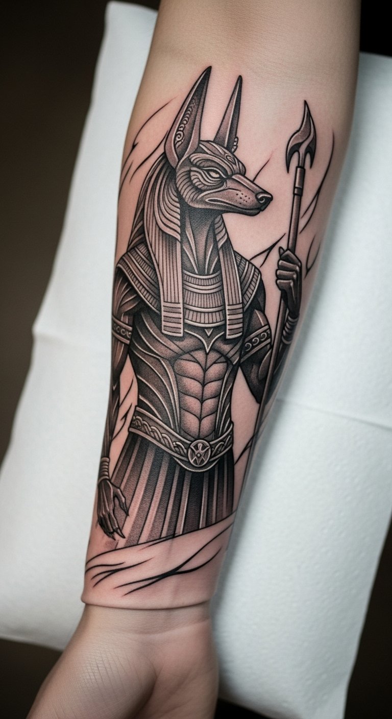 The Anubis tattoo on the forearm serves as a powerful emblem of protection and transformation, reflecting the wearer’s journey through life.