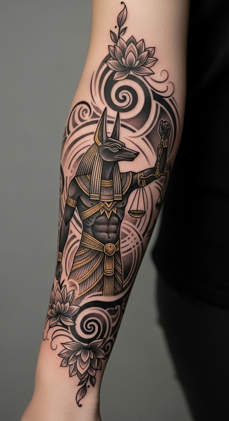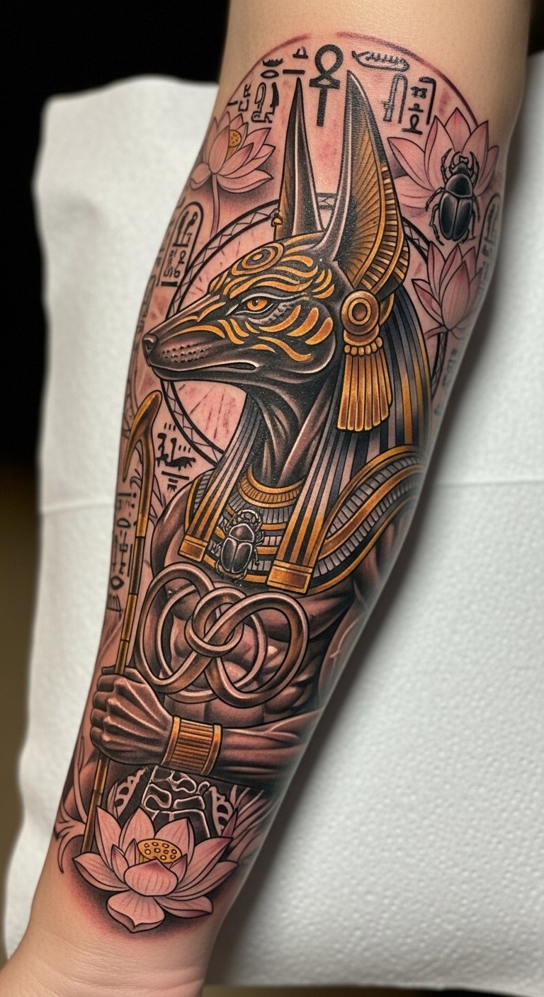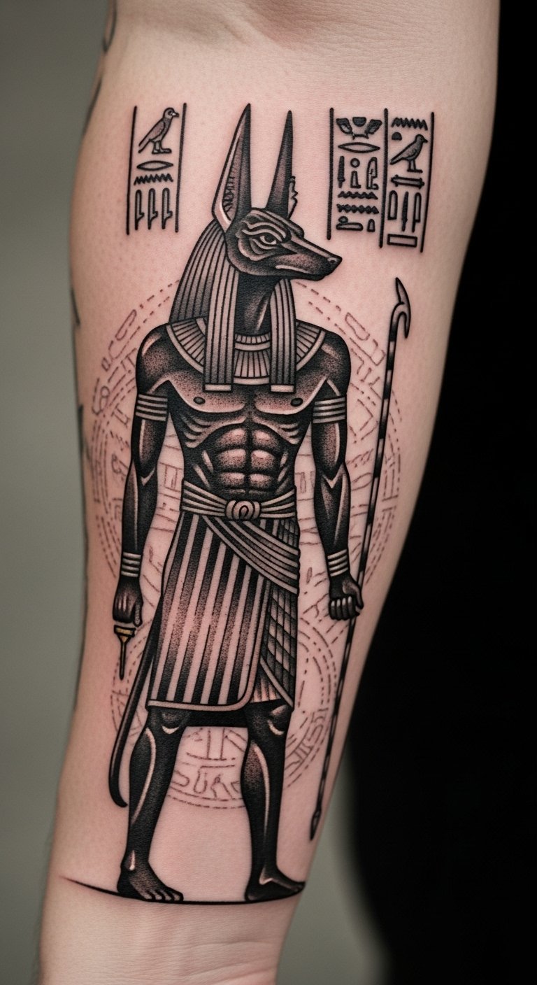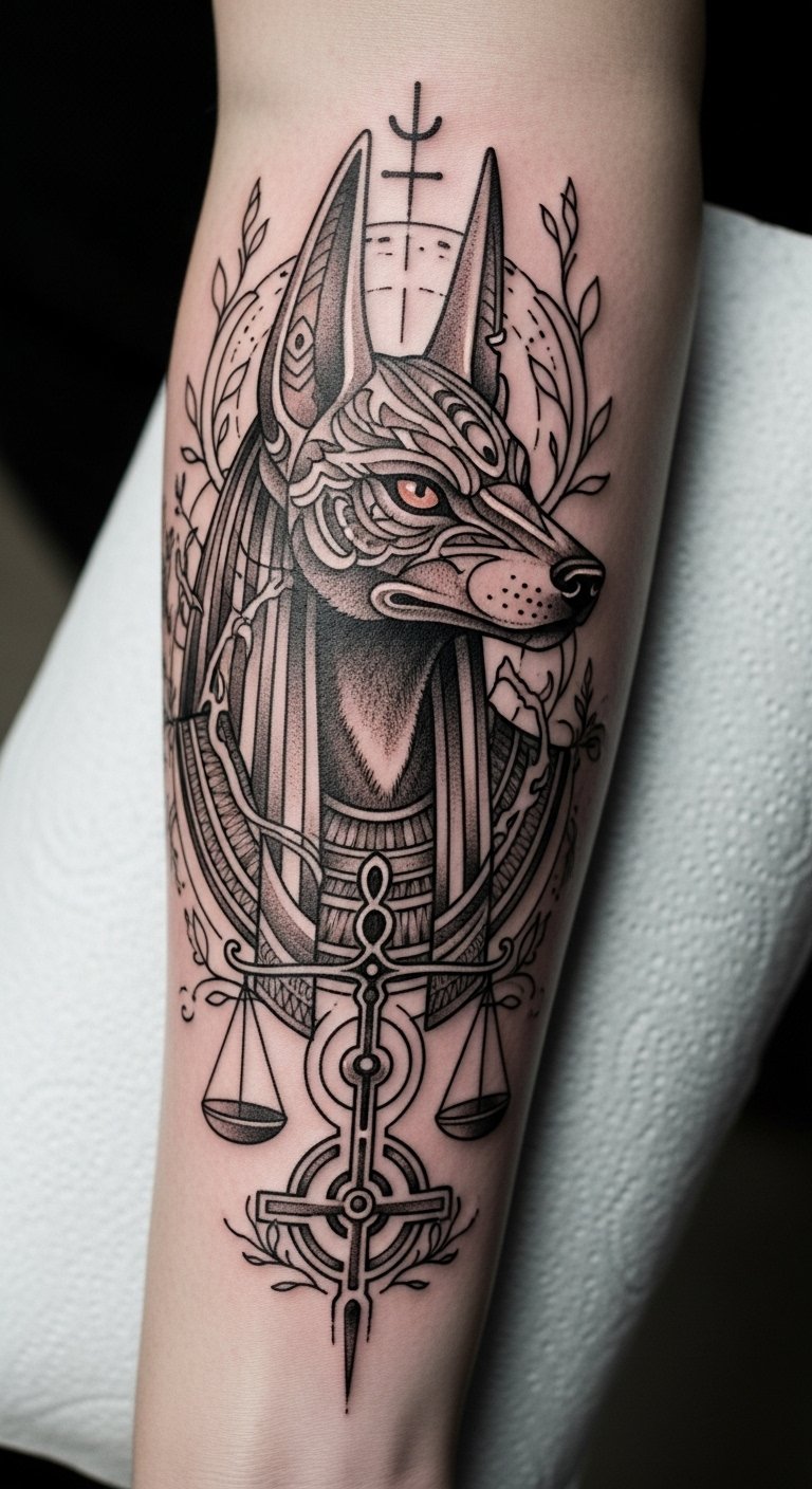 The Anubis tattoo on the forearm serves as a powerful emblem of protection and transformation, reflecting the wearer’s journey through life.