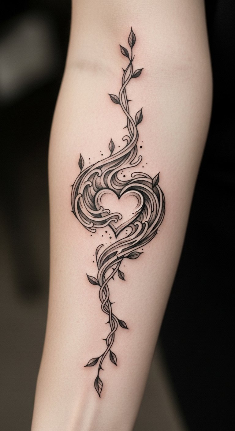 The tattoo symbolizes the journey of quiet endurance through adversity. The vine represents resilience and growth, while the heart at its core signifies the calm strength that guides you.