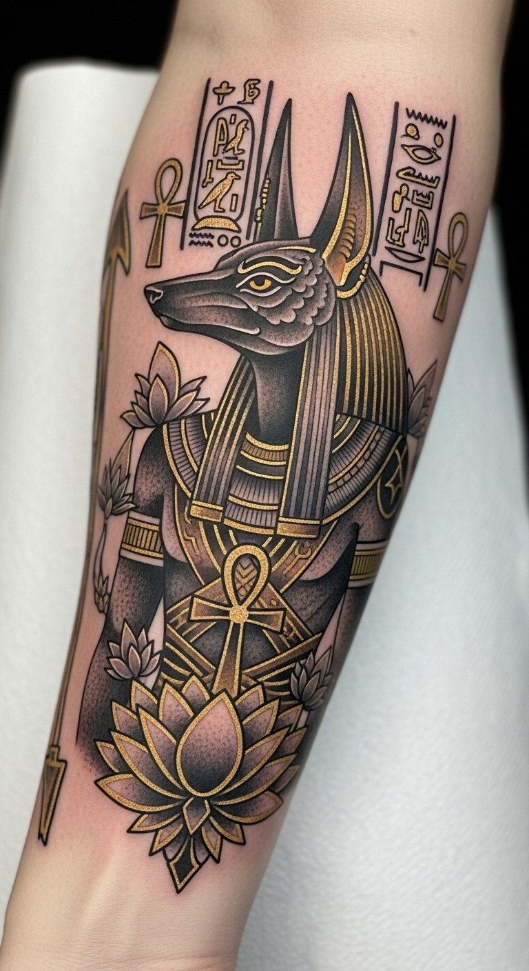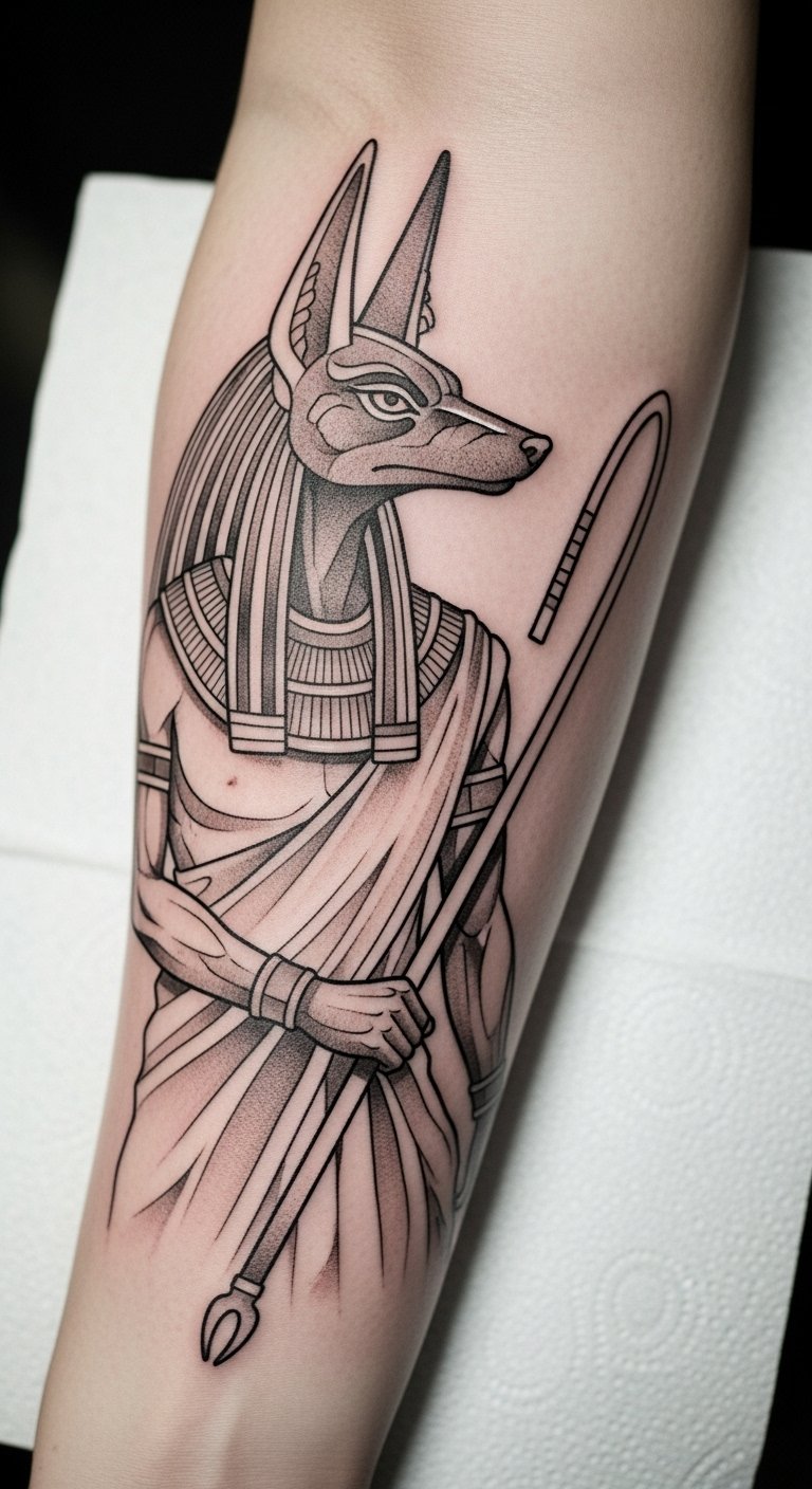This Anubis tattoo, placed on the forearm, symbolizes guidance through life’s transitions and the protective powers associated with rebirth.