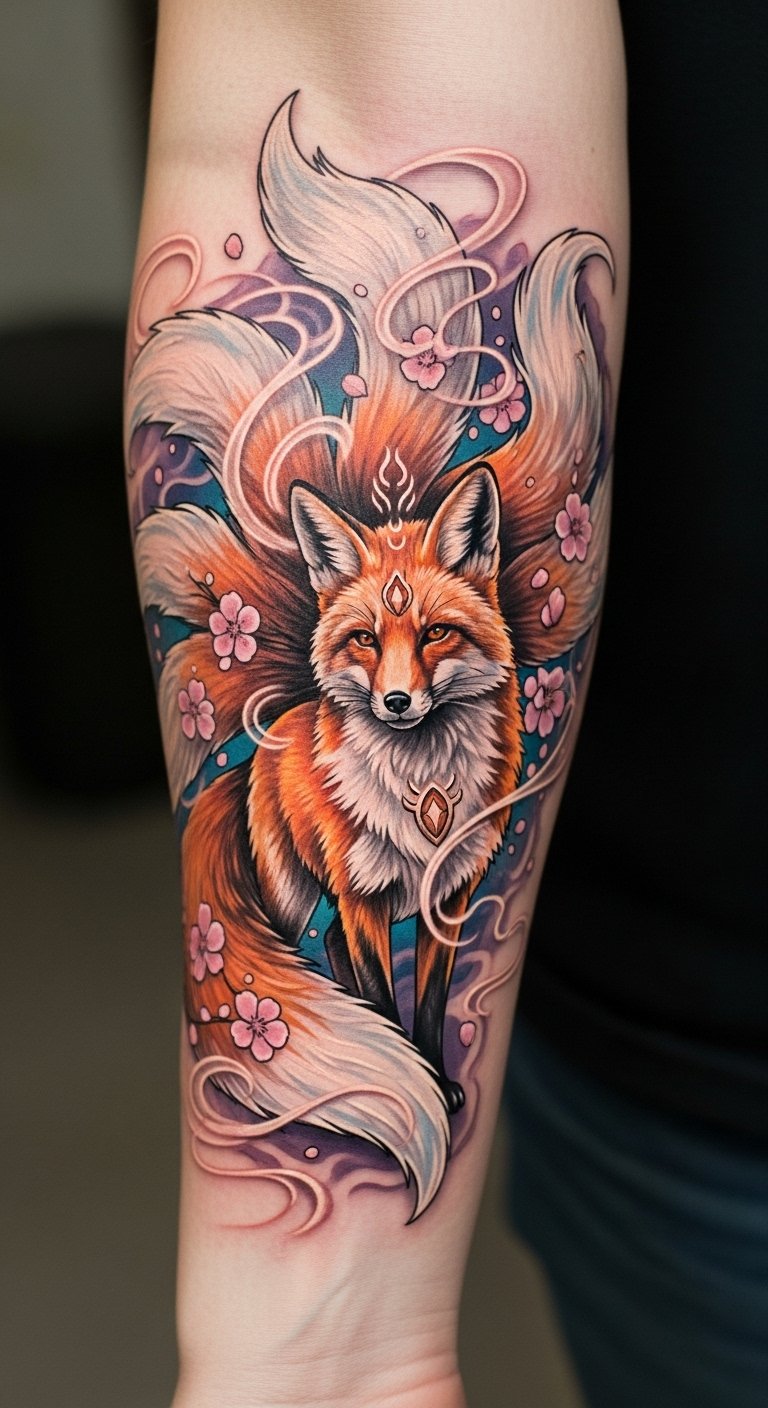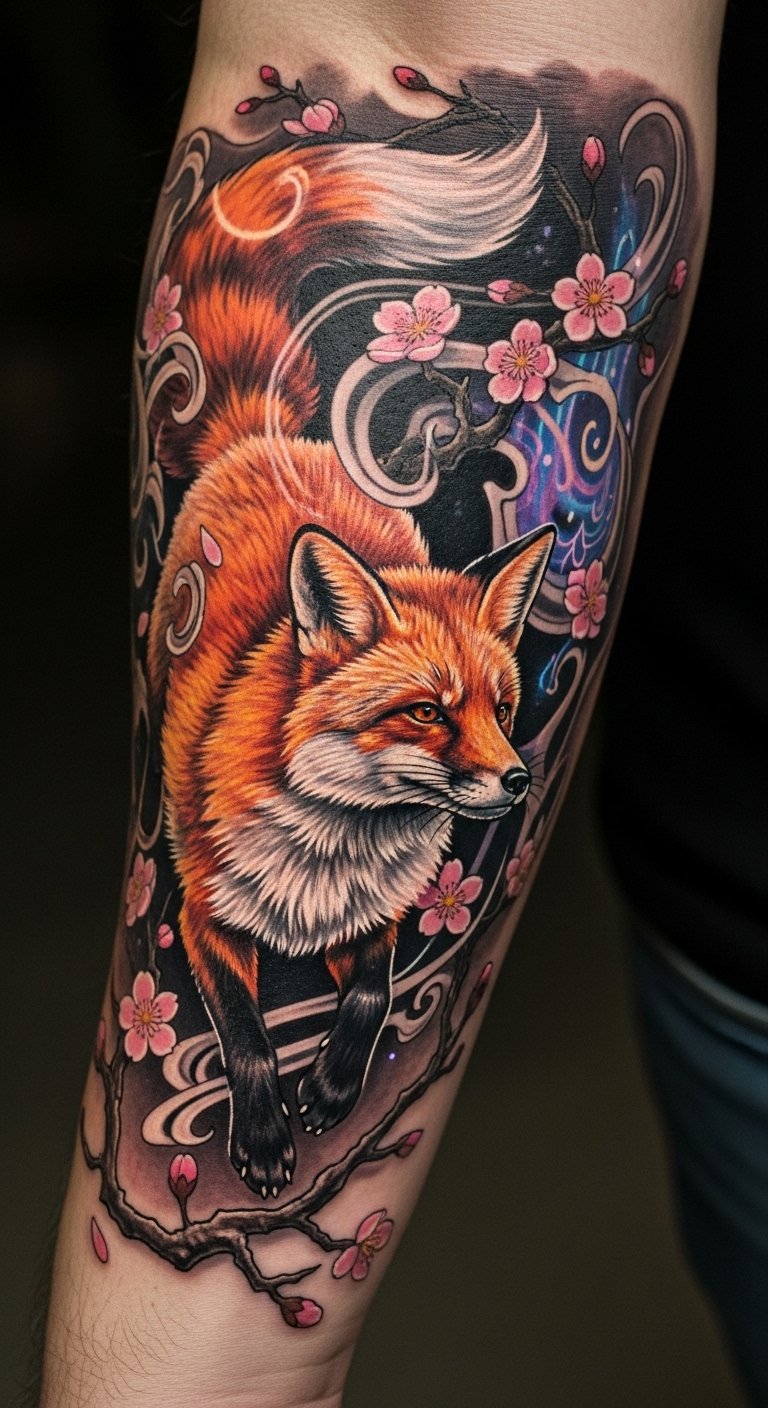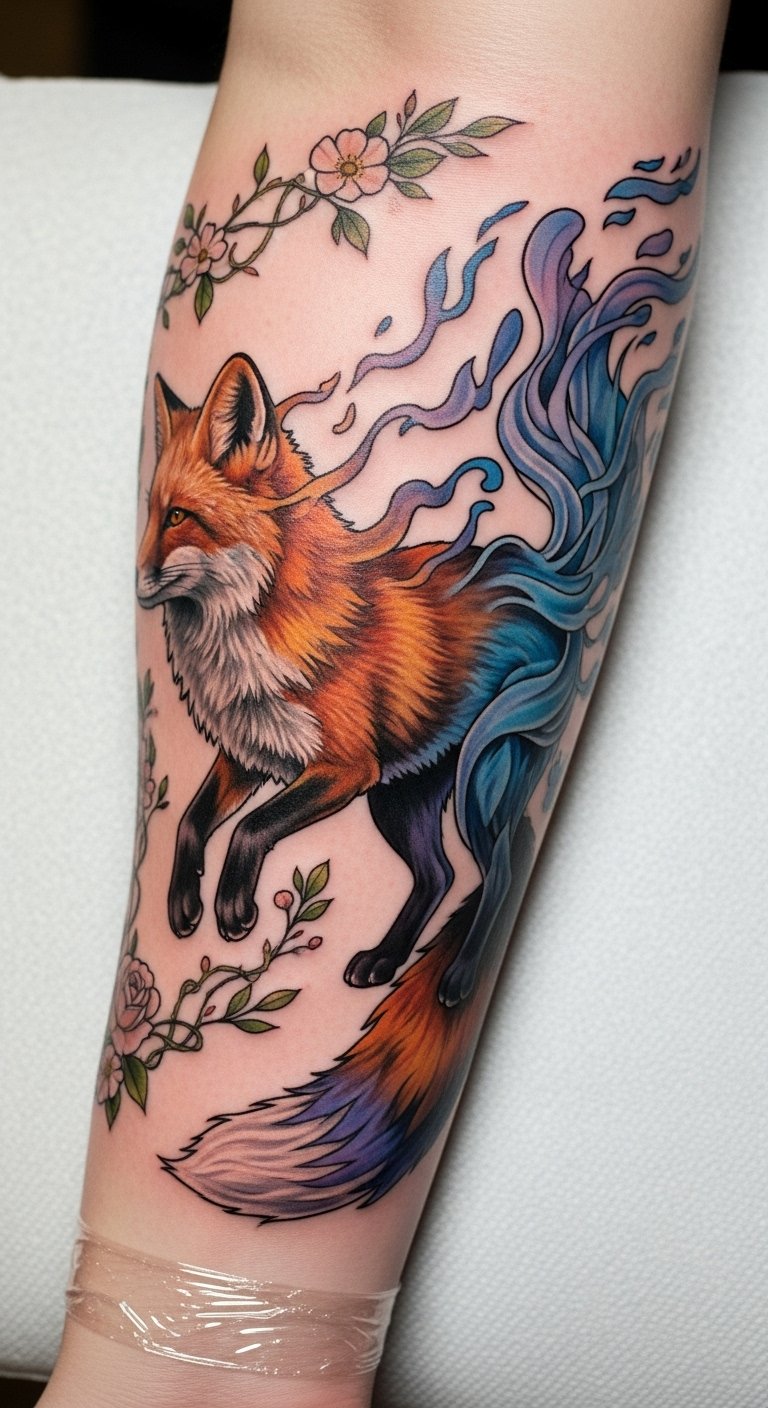 The tattoo symbolizes wisdom, transformation, and the duality of life, embodying the fox’s role as both guardian and trickster.