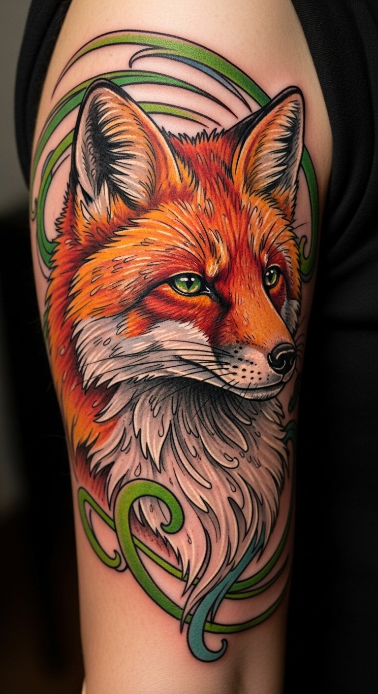 This fox tattoo symbolizes profound emotional intelligence, embodying both cunning and empathy.