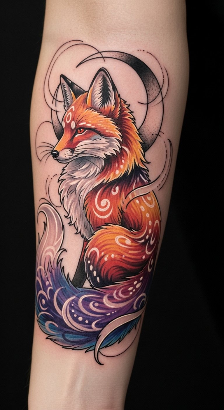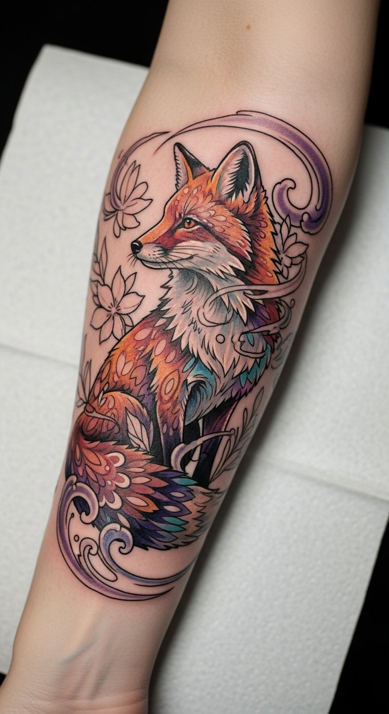 Positioned on the forearm, this design serves as a constant reminder of the fox’s cunning nature and the wisdom it embodies. The vibrant colors and intricate details invite admiration, while the placement allows for personal expression and easy visibility, encouraging a connection to the rich folklore and multifaceted nature of the fox.