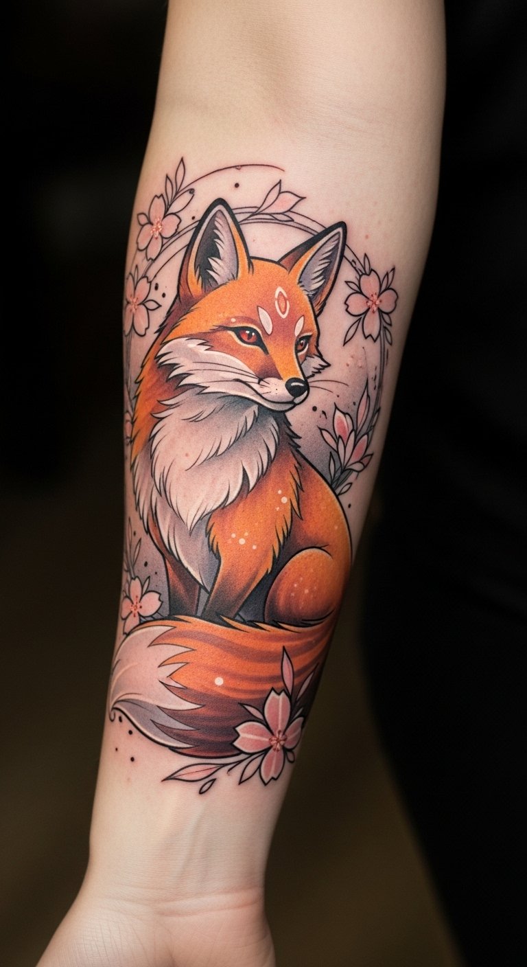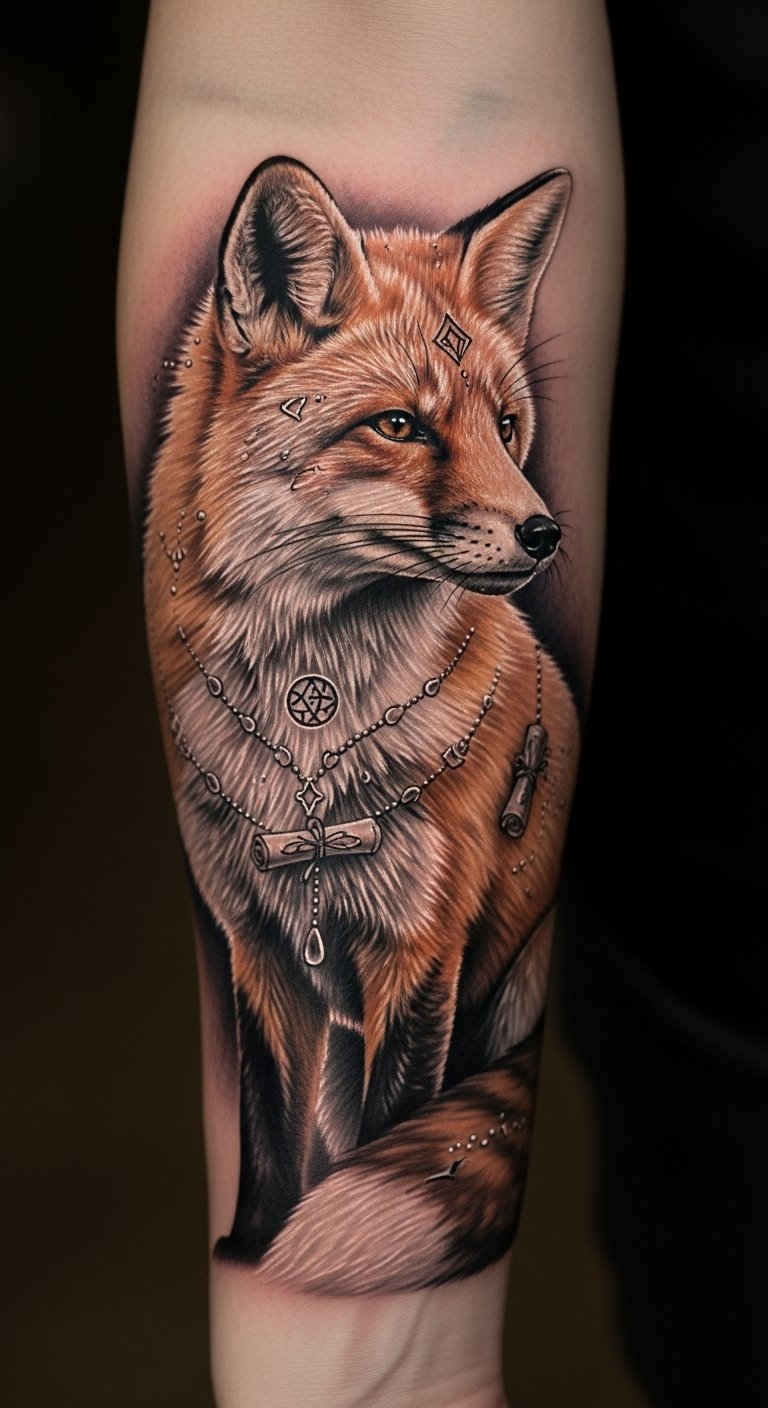 The fox tattoo on the forearm serves as a powerful emblem of fertility and prosperity, seamlessly blending with the natural contours of the skin.