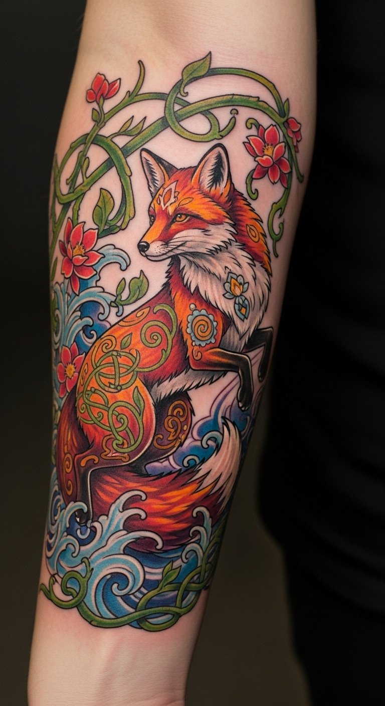 The fox tattoo symbolizes cleverness and transformation, drawing from its rich cultural meanings across global folklore.