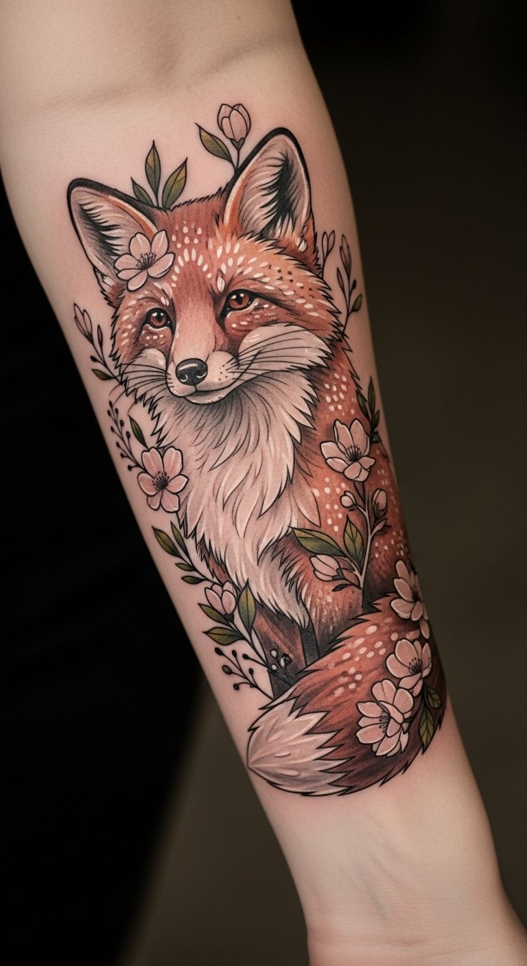 The floral motifs enhance the mystical nature of the fox, creating a harmonious blend of nature and spirit, while the visibility of the tattoo encourages everyday inspiration and connection to one’s inner self.